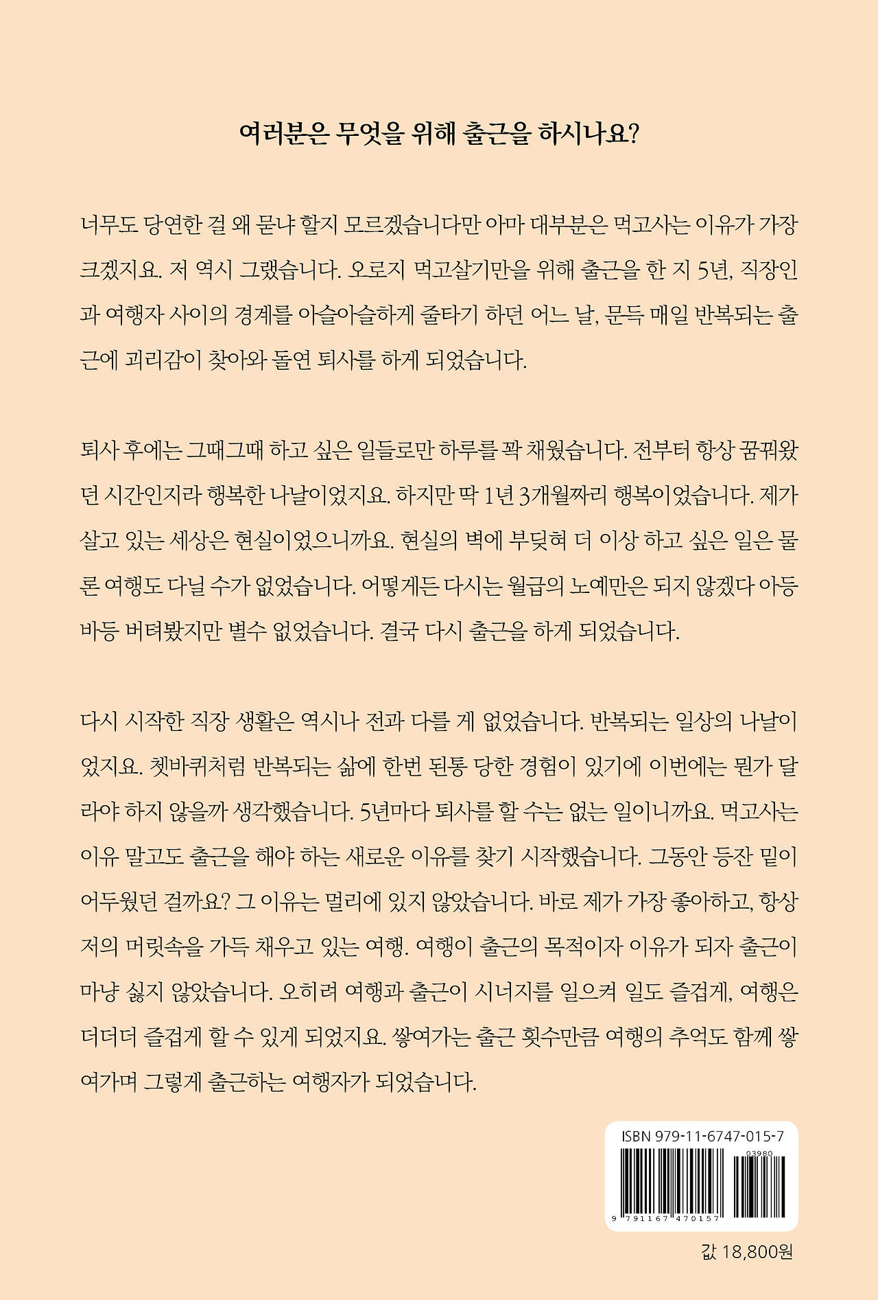 여행하기 위해 출근하는 12년 차 직딩의 12개국 21개 도시에서의 여행썰입니다. 여행 중 특별한 날도 있었고 오히려 일상보다 더 평범한 날도 있었지요. 그중 기억에 남는 썰들을 모아 꾹꾹 눌러 담았습니다. 퇴사 후 다녀온 나 홀로 세계일주 같은 거창한 여행이 아닌, 직장생활을 하며 다녀온 우리네들의 일상 같은 여행기이기에 쉽게 공감하실 수 있으실 거예요. 소소한 위로와 웃음을 전해 주는 동시에 각자의 마음속에 있는 그날의 추억을 끄집어내어 혹 겨울잠에 빠진 여행세포가 깨어나길 바랍니다.