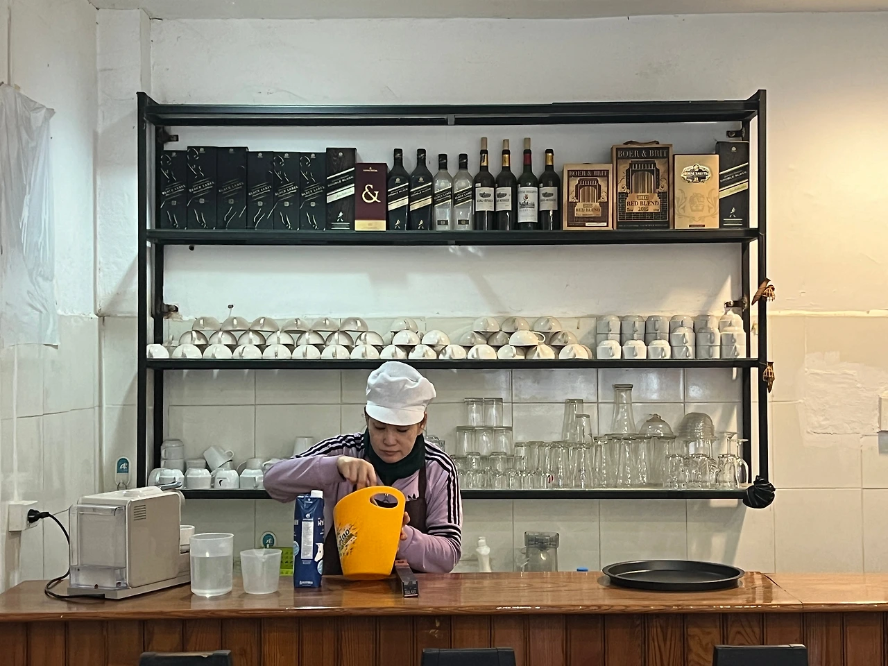 우려와 걱정 속에 겨우 자리를 잡았으나 커피를 내리는 사장님을 보자마자 신선한 충격과 함께 바로 다시 일어나고 싶은 충동이 강력하게 일어났다. 커피를 내리기 위해 사장님이 꺼낸 기계는 에스프레소 머신이 아닌, 무려 캡슐커피머신! 그제야 벽에 붙은 음식 사진들이 이해가 되면서 의문의 퍼즐이 하나씩 맞춰지는 것 같았다. 어쩌면 커피는 본래 파는 메뉴가 아니고 식사 후 후식으로 주는 것일지도 모르겠다는 느낌적인 직감.(후식으론 캡슐커피도 충분히 훌륭하니까) 그렇지 않고서야 명색이 커피숍에서 캡슐커피를 판다고?! 믹스 커피가 아닌 게 다행이라고 생각해야하나? 라오스 로컬 커피를 기대하기는 글렀지만 이미 주문도 다 들어갔고 무엇보다 열심히 쉐킷쉐킷하고 있는 사장님을 보니 차마 무를 수가 없었다. 본래 이게 찐 라오스 커피일 거라, 라오스만의 갬성이리라 최면을 걸고 커피를 기다렸다.