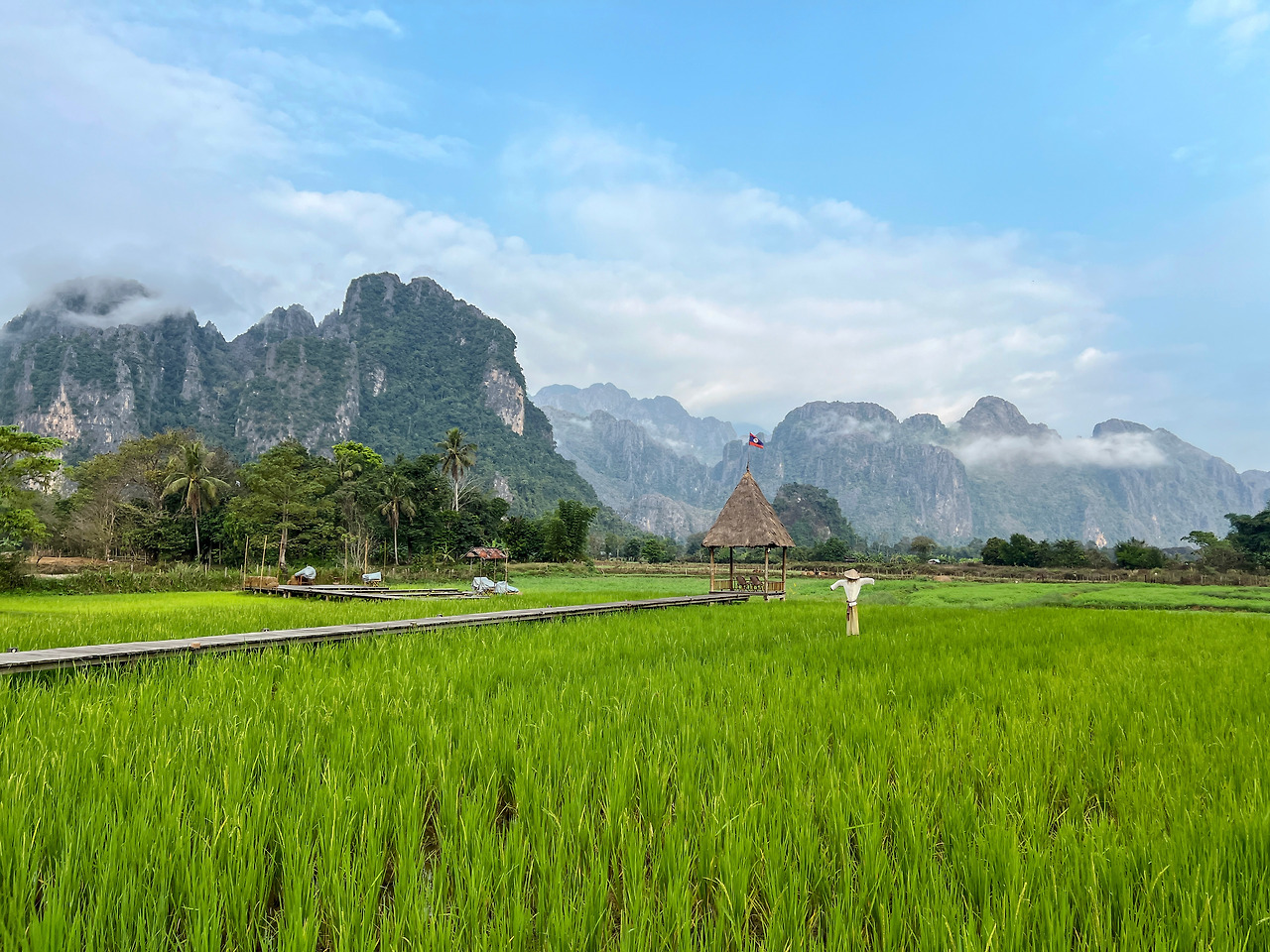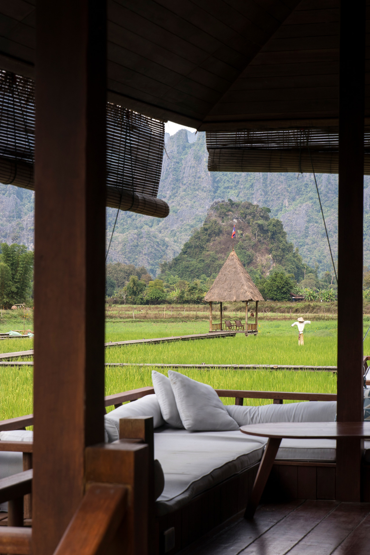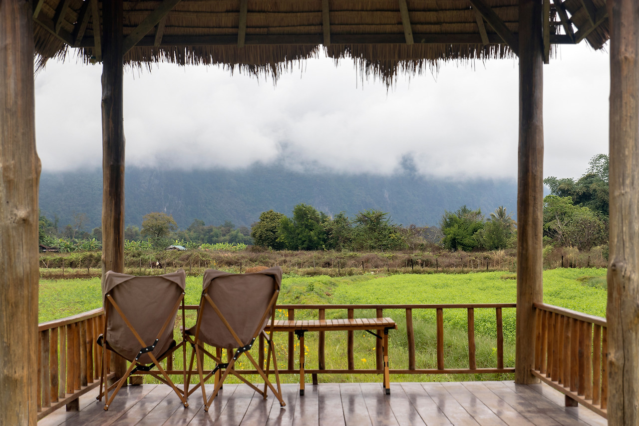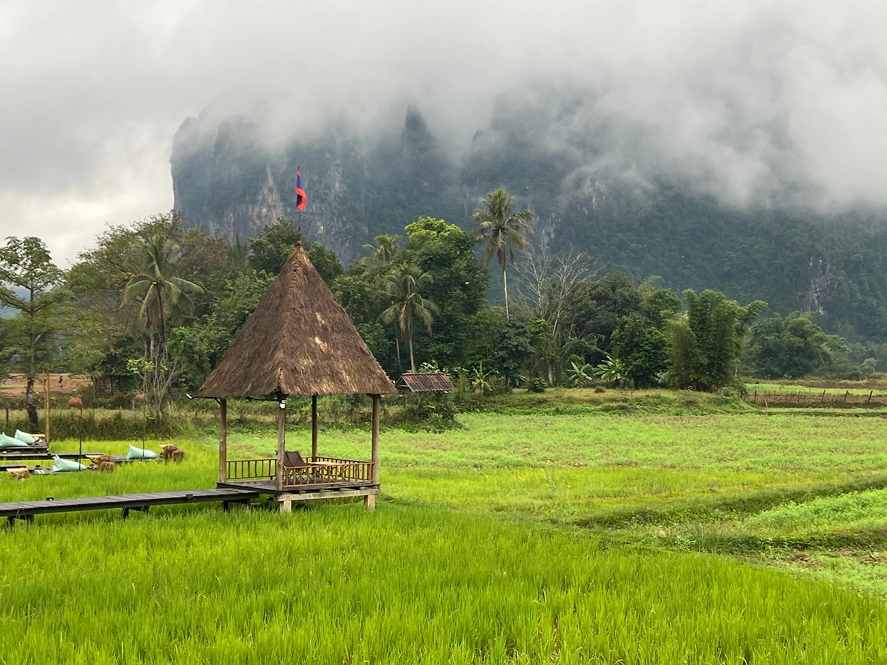 이미 사진과 영상으로 몇 번을 보고 왔지만 역시나 오감으로 직관하는 감동은 차원이 달랐다. 사진과 영상으로 아무리 잘 찍어도 담을 수 없는 비엥타라 방비엥 리조트 특유의 바이브가 느껴졌다. 뭐 엄청나게 웅장한 대자연이 펼쳐져 있다거나, 방비엥이 아니면 볼 수 없는 유니크한 어떤 자연현상이 있다거나, 지구가 아닌 것 같은 비현실적인 풍경이 있는 것은 아니었다. 그저 저 푸른 초원 위에 그림 같은 오두막하나 지어져 있고 그 뒤로 어림잡아 대충 인왕산 높이 정도 되어 보이는, 그래서 정선의 인왕제색도가 떠오르는 산이 있을 뿐이었다. 각각의 풍경 하나하나는 우리나라 여느 시골에서도 흔히 마주칠 수 있는 모습들이었지만 이 단순한 조합이 대체 뭐라고 가슴이 탁 트이는 동시에 가슴을 무언가에 퉁! 얻어맞은 듯한(이런 걸 벅차다고 하는 걸까?) 기분이 들었다. 보는 내내 할 말을 잃고 입만 헤~ 벌린 채 카메라에 담기 바빴다. 숙소를 고를 때 1순위로 보는 게 뷰인 뷰친놈(뷰에 미친놈)으로서 나름 국내외 뷰맛집 숙소들을 제법 찾아다녔지만 이런 뷰는 처음이었다. 한동안 절대 변하지 않을 줄 알았던, 신혼여행으로 다녀왔던 이집트 후루가다의 홍해 오션뷰 인생숙소가 단번에 갱신돼버렸다. 홍해바다쯤이야 뭐... 바다는 다른 데서도 볼 수 있는 곳이 많지만 이런 촌뷰는 오직 라오스 방비엥, 방비엥에서도 비엥타라 방비엥 리조트가 아니면 아마도 볼 수가 없을 테니까.