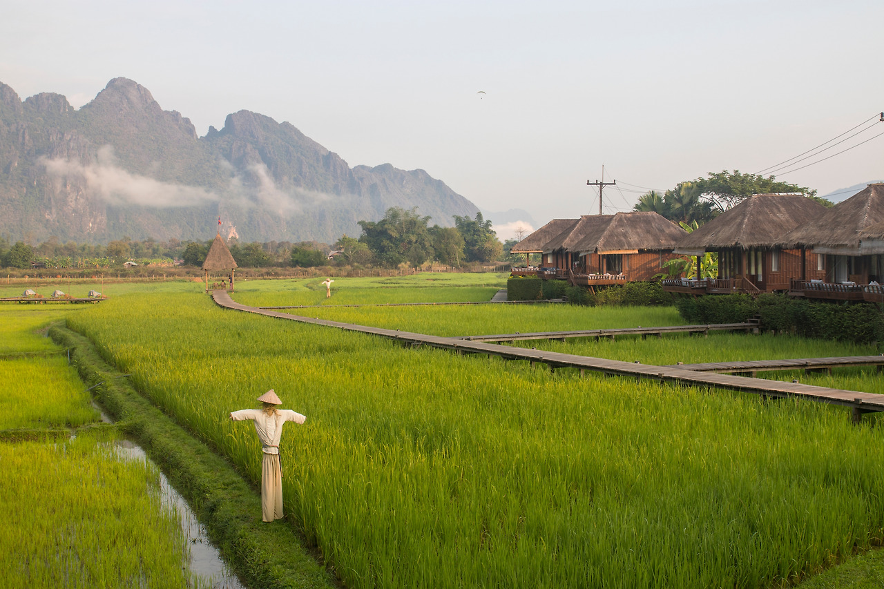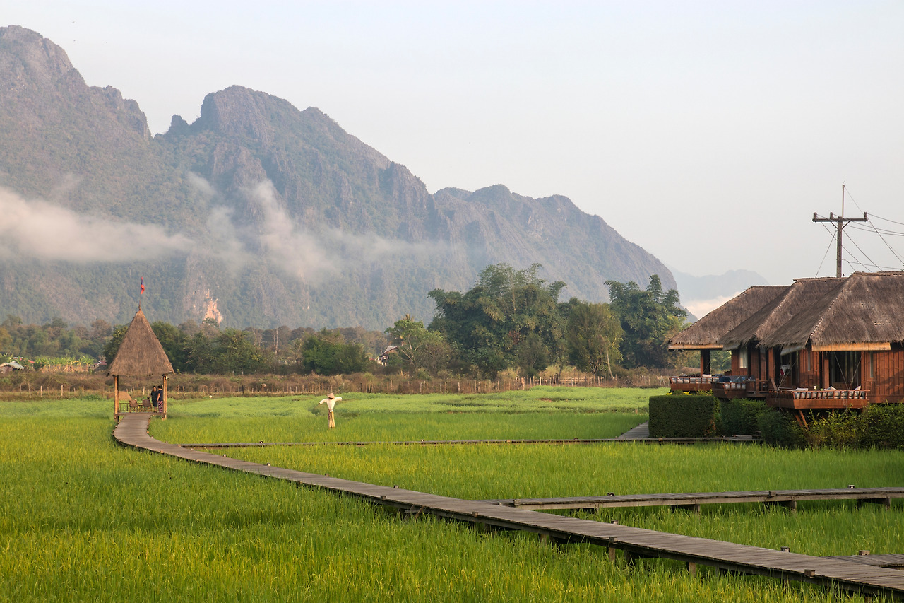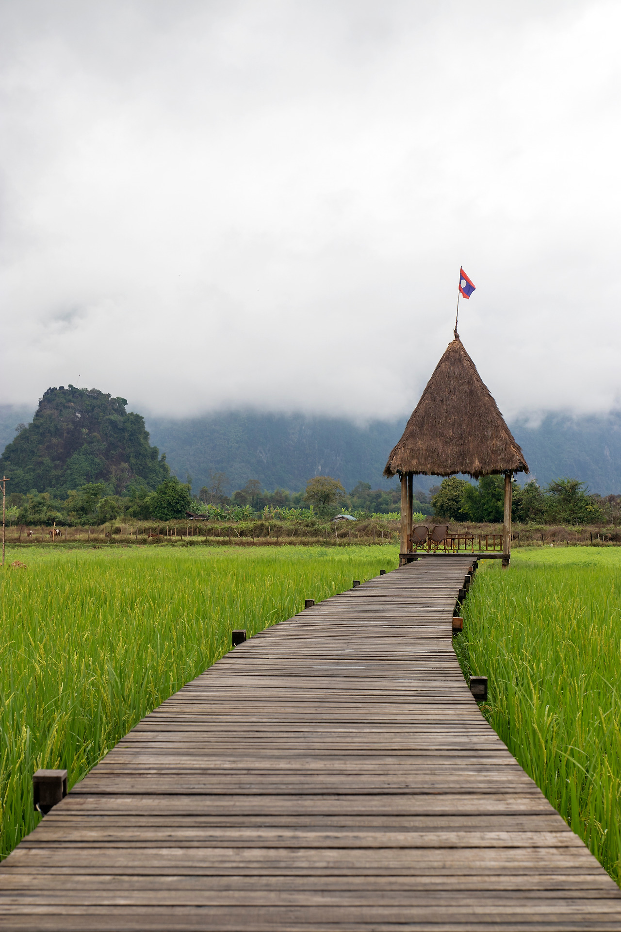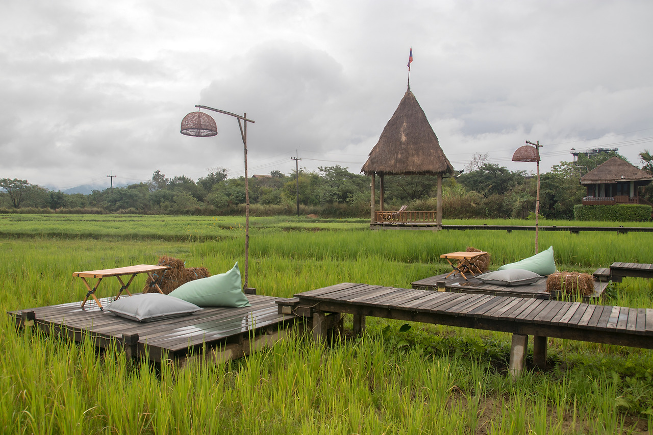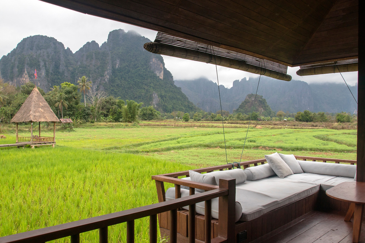 이미 사진과 영상으로 몇 번을 보고 왔지만 역시나 오감으로 직관하는 감동은 차원이 달랐다. 사진과 영상으로 아무리 잘 찍어도 담을 수 없는 비엥타라 방비엥 리조트 특유의 바이브가 느껴졌다. 뭐 엄청나게 웅장한 대자연이 펼쳐져 있다거나, 방비엥이 아니면 볼 수 없는 유니크한 어떤 자연현상이 있다거나, 지구가 아닌 것 같은 비현실적인 풍경이 있는 것은 아니었다. 그저 저 푸른 초원 위에 그림 같은 오두막하나 지어져 있고 그 뒤로 어림잡아 대충 인왕산 높이 정도 되어 보이는, 그래서 정선의 인왕제색도가 떠오르는 산이 있을 뿐이었다. 각각의 풍경 하나하나는 우리나라 여느 시골에서도 흔히 마주칠 수 있는 모습들이었지만 이 단순한 조합이 대체 뭐라고 가슴이 탁 트이는 동시에 가슴을 무언가에 퉁! 얻어맞은 듯한(이런 걸 벅차다고 하는 걸까?) 기분이 들었다. 보는 내내 할 말을 잃고 입만 헤~ 벌린 채 카메라에 담기 바빴다. 숙소를 고를 때 1순위로 보는 게 뷰인 뷰친놈(뷰에 미친놈)으로서 나름 국내외 뷰맛집 숙소들을 제법 찾아다녔지만 이런 뷰는 처음이었다. 한동안 절대 변하지 않을 줄 알았던, 신혼여행으로 다녀왔던 이집트 후루가다의 홍해 오션뷰 인생숙소가 단번에 갱신돼버렸다. 홍해바다쯤이야 뭐... 바다는 다른 데서도 볼 수 있는 곳이 많지만 이런 촌뷰는 오직 라오스 방비엥, 방비엥에서도 비엥타라 방비엥 리조트가 아니면 아마도 볼 수가 없을 테니까.