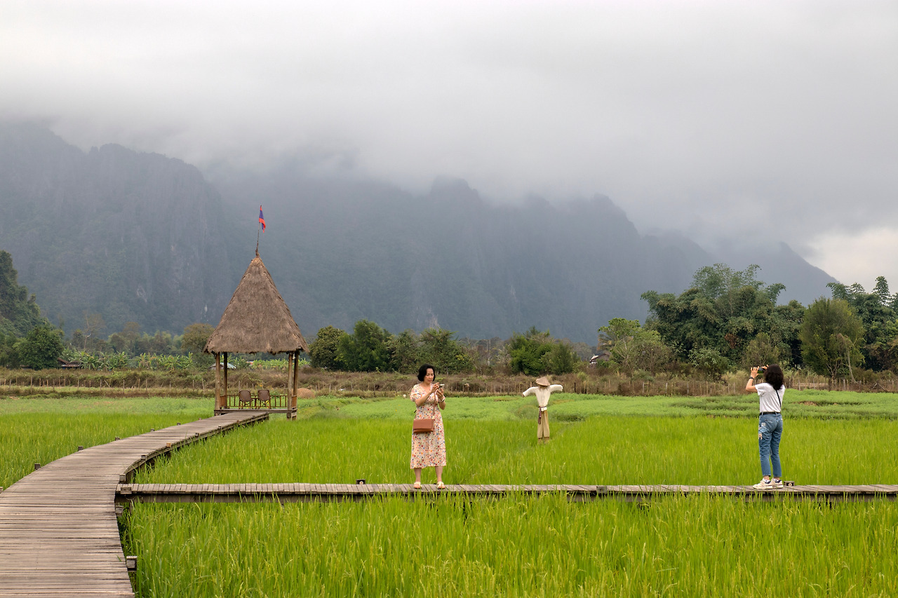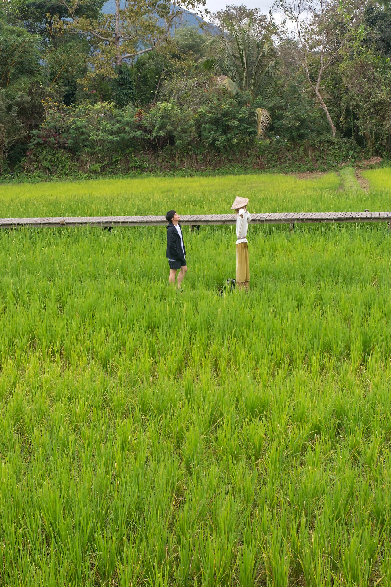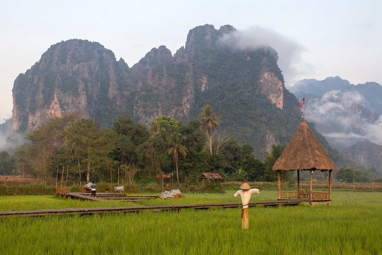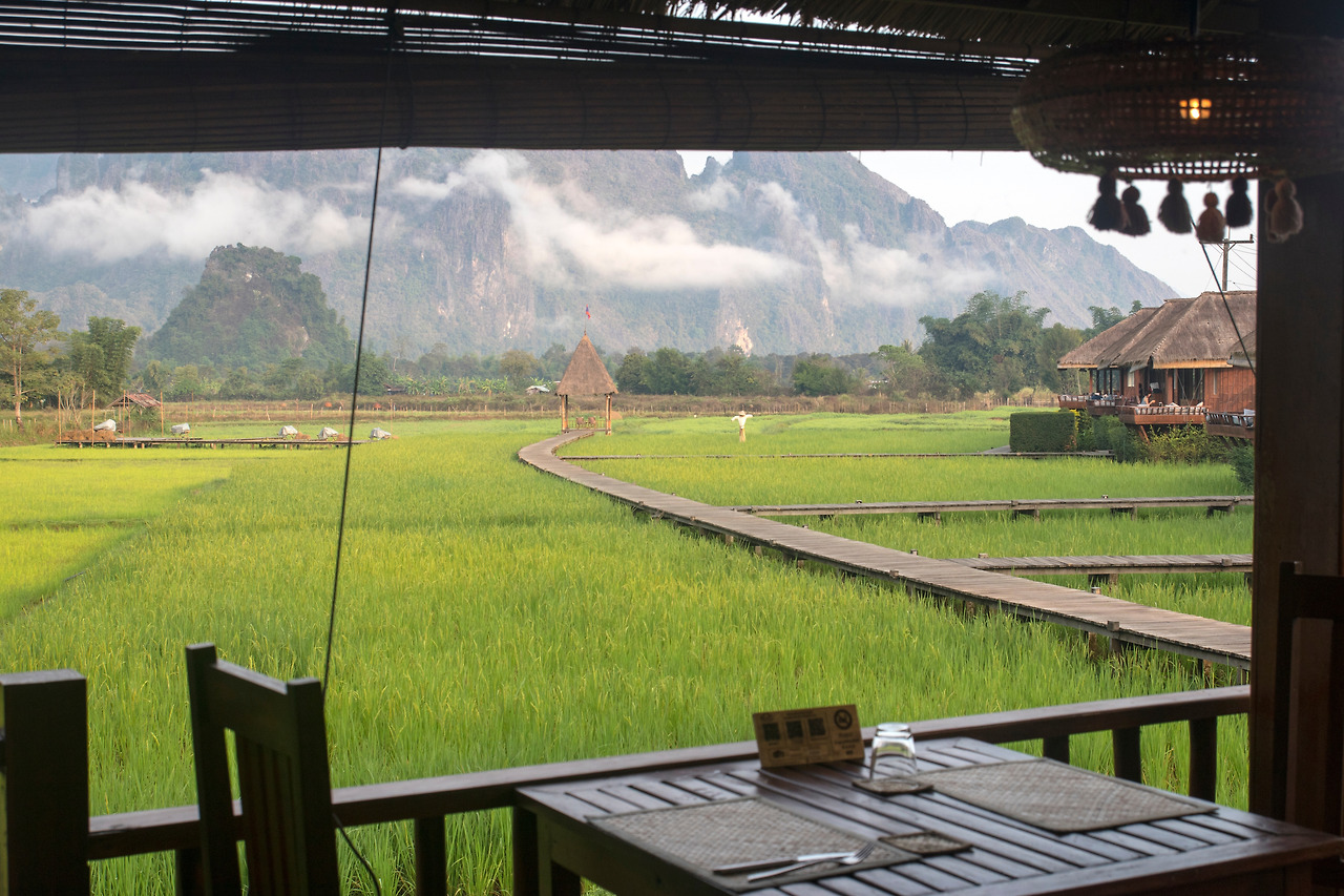 이미 사진과 영상으로 몇 번을 보고 왔지만 역시나 오감으로 직관하는 감동은 차원이 달랐다. 사진과 영상으로 아무리 잘 찍어도 담을 수 없는 비엥타라 방비엥 리조트 특유의 바이브가 느껴졌다. 뭐 엄청나게 웅장한 대자연이 펼쳐져 있다거나, 방비엥이 아니면 볼 수 없는 유니크한 어떤 자연현상이 있다거나, 지구가 아닌 것 같은 비현실적인 풍경이 있는 것은 아니었다. 그저 저 푸른 초원 위에 그림 같은 오두막하나 지어져 있고 그 뒤로 어림잡아 대충 인왕산 높이 정도 되어 보이는, 그래서 정선의 인왕제색도가 떠오르는 산이 있을 뿐이었다. 각각의 풍경 하나하나는 우리나라 여느 시골에서도 흔히 마주칠 수 있는 모습들이었지만 이 단순한 조합이 대체 뭐라고 가슴이 탁 트이는 동시에 가슴을 무언가에 퉁! 얻어맞은 듯한(이런 걸 벅차다고 하는 걸까?) 기분이 들었다. 보는 내내 할 말을 잃고 입만 헤~ 벌린 채 카메라에 담기 바빴다. 숙소를 고를 때 1순위로 보는 게 뷰인 뷰친놈(뷰에 미친놈)으로서 나름 국내외 뷰맛집 숙소들을 제법 찾아다녔지만 이런 뷰는 처음이었다. 한동안 절대 변하지 않을 줄 알았던, 신혼여행으로 다녀왔던 이집트 후루가다의 홍해 오션뷰 인생숙소가 단번에 갱신돼버렸다. 홍해바다쯤이야 뭐... 바다는 다른 데서도 볼 수 있는 곳이 많지만 이런 촌뷰는 오직 라오스 방비엥, 방비엥에서도 비엥타라 방비엥 리조트가 아니면 아마도 볼 수가 없을 테니까.