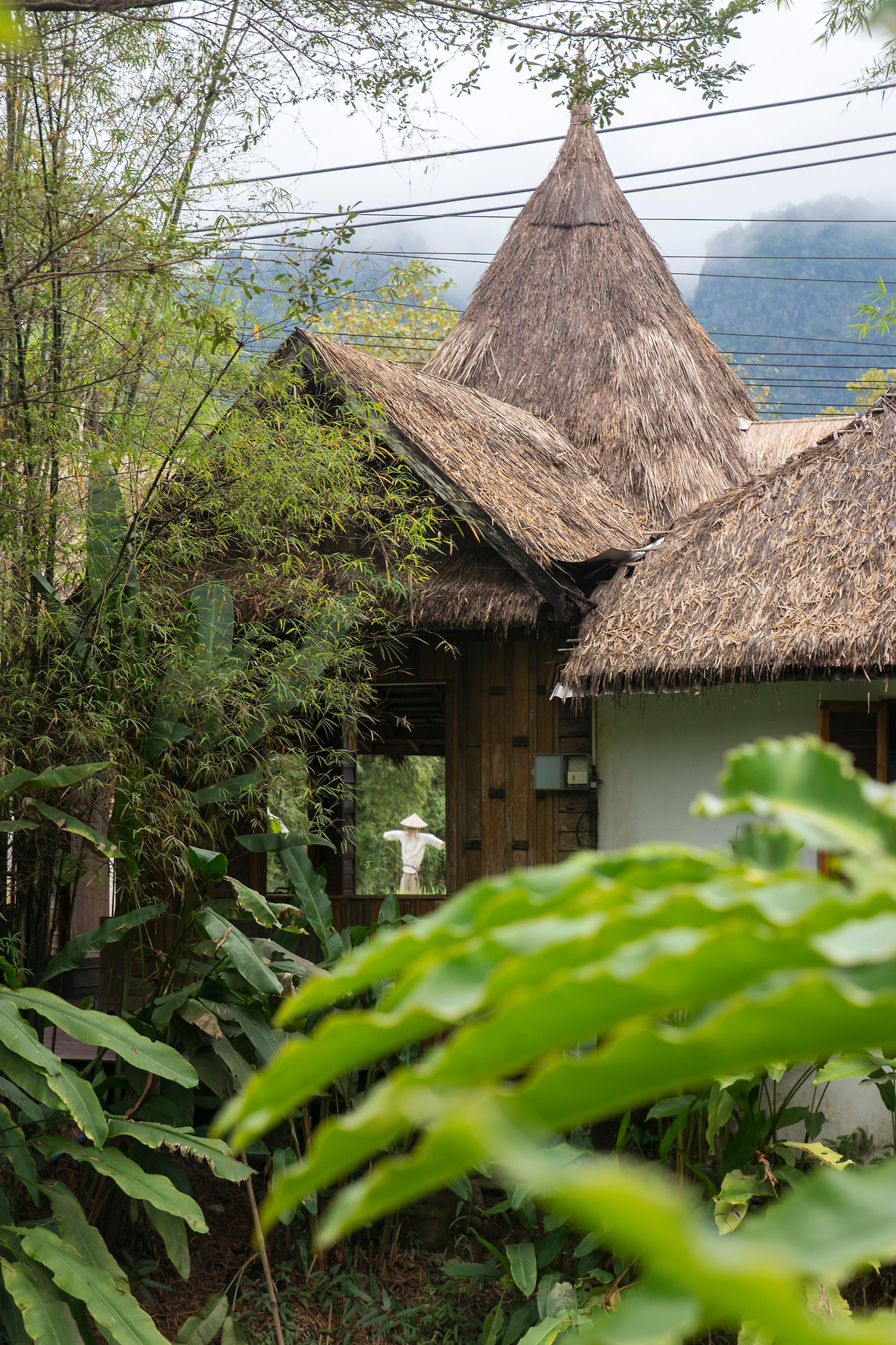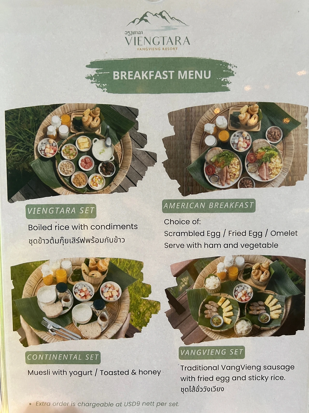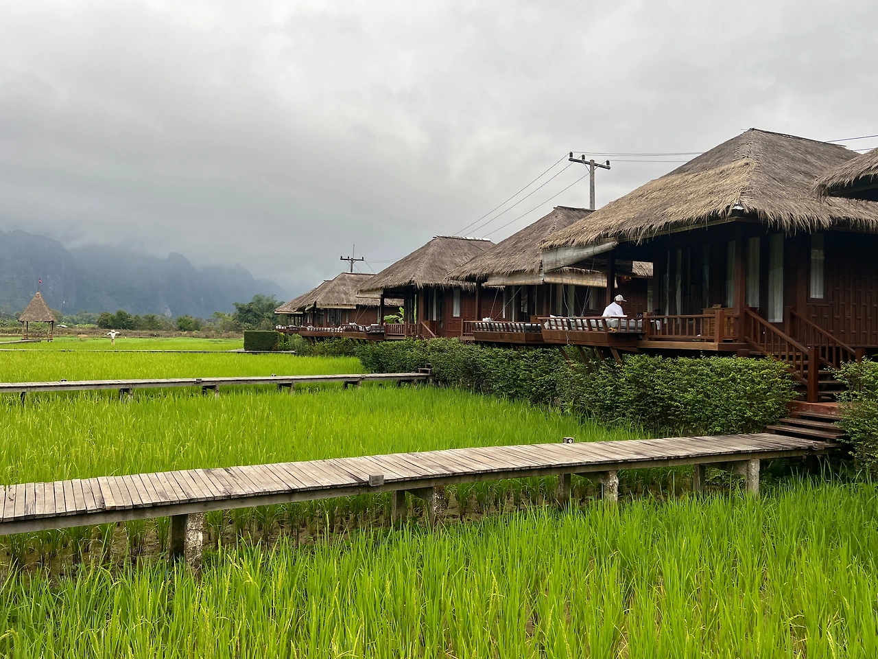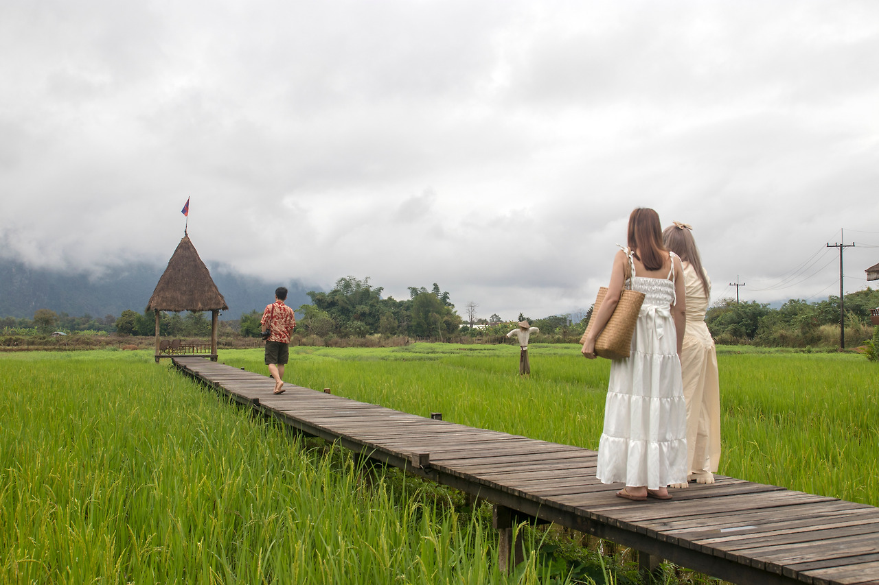 라오스여행을 준비하면서 배낭이냐 vs 캐리어냐 만큼이나 진심이었던 것이 있다면 방비엥 숙소다. 방비엥 여행자거리 근처에 마운틴뷰의 인피니티풀과 조식뷔페가 있는 모던하면서도 깔끔하고 가성비 좋은 호텔이나 리조트들이 있었지만 우리들의 타깃은 닥치고 방갈로였다. 방갈로를 고집하게 된 데에는 우리의 라오스 청춘여행 모티브이자 로망이라 할 수 있는 꽃청춘(꽃보다 청춘 라오스 편, tvN 2014년 방영)의 영향이 컸다. 당시 세 청춘이 방비엥에서 묵었던 숙소가 바로 통나무집 스타일의 방갈로였기 때문. (벌써?!) 10년이나 지난 지금도 그 숙소는 여전히 꽃청춘 타이틀과 함께 성업 중이었다. 꽃청춘의 여파인지는 모르겠으나 현재는 그 숙소 말고도 방갈로 형태의 숙소들이 남쏭강 주변으로 많이 생긴 것 같았다. 하나하나 둘러보며 뷰, 위치, 시설, 가격 등 기본적인 숙소정보와 느낌을 비교했다. 그러다가 한 여행인플루언서의 인스타를 통해 신상 방갈로 숙소를 발견하게 되었다. '비엥타라 방비엥 리조트(ViengTara VangVieng Resort)'. 피드에 드론으로 찍은 숙소 영상이 올라와있었는데 이걸 본 이상 도저히 가지 않을 수가 없었다. 여행자거리에서 접근성이 (아주) 떨어진다는 치명적인 단점과 주변 숙소 대비 가격도 높아 가성비까지 떨어짐에도 불구하고 시설 좋고 가성비, 접근성까지 완벽한 호텔이나 리조트들은 물론이요, 꽃청춘 숙소 포함 다른 방갈로 숙소들 조차 모조리 아웃 오브 안중이 돼버렸다. 단톡방에 쏘아 올린 숙소 영상과 정보를 본 멤버들 역시 만장일치 프리패스. 그리하여 방비엥에서의 이틀을 비엥타라 방비엥 리조트에서 머물게 되었다.