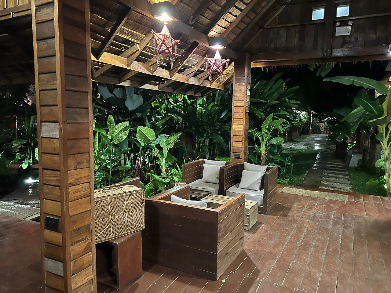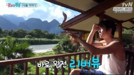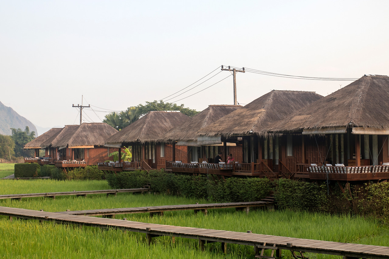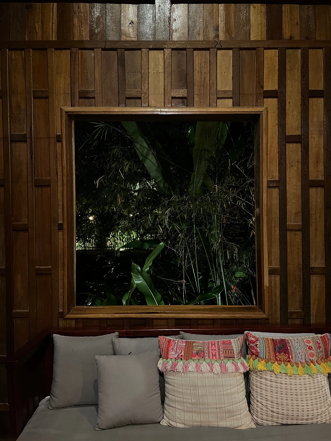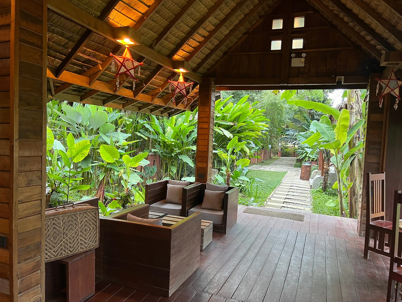 라오스여행을 준비하면서 배낭이냐 vs 캐리어냐 만큼이나 진심이었던 것이 있다면 방비엥 숙소다. 방비엥 여행자거리 근처에 마운틴뷰의 인피니티풀과 조식뷔페가 있는 모던하면서도 깔끔하고 가성비 좋은 호텔이나 리조트들이 있었지만 우리들의 타깃은 닥치고 방갈로였다. 방갈로를 고집하게 된 데에는 우리의 라오스 청춘여행 모티브이자 로망이라 할 수 있는 꽃청춘(꽃보다 청춘 라오스 편, tvN 2014년 방영)의 영향이 컸다. 당시 세 청춘이 방비엥에서 묵었던 숙소가 바로 통나무집 스타일의 방갈로였기 때문. (벌써?!) 10년이나 지난 지금도 그 숙소는 여전히 꽃청춘 타이틀과 함께 성업 중이었다. 꽃청춘의 여파인지는 모르겠으나 현재는 그 숙소 말고도 방갈로 형태의 숙소들이 남쏭강 주변으로 많이 생긴 것 같았다. 하나하나 둘러보며 뷰, 위치, 시설, 가격 등 기본적인 숙소정보와 느낌을 비교했다. 그러다가 한 여행인플루언서의 인스타를 통해 신상 방갈로 숙소를 발견하게 되었다. '비엥타라 방비엥 리조트(ViengTara VangVieng Resort)'. 피드에 드론으로 찍은 숙소 영상이 올라와있었는데 이걸 본 이상 도저히 가지 않을 수가 없었다. 여행자거리에서 접근성이 (아주) 떨어진다는 치명적인 단점과 주변 숙소 대비 가격도 높아 가성비까지 떨어짐에도 불구하고 시설 좋고 가성비, 접근성까지 완벽한 호텔이나 리조트들은 물론이요, 꽃청춘 숙소 포함 다른 방갈로 숙소들 조차 모조리 아웃 오브 안중이 돼버렸다. 단톡방에 쏘아 올린 숙소 영상과 정보를 본 멤버들 역시 만장일치 프리패스. 그리하여 방비엥에서의 이틀을 비엥타라 방비엥 리조트에서 머물게 되었다.