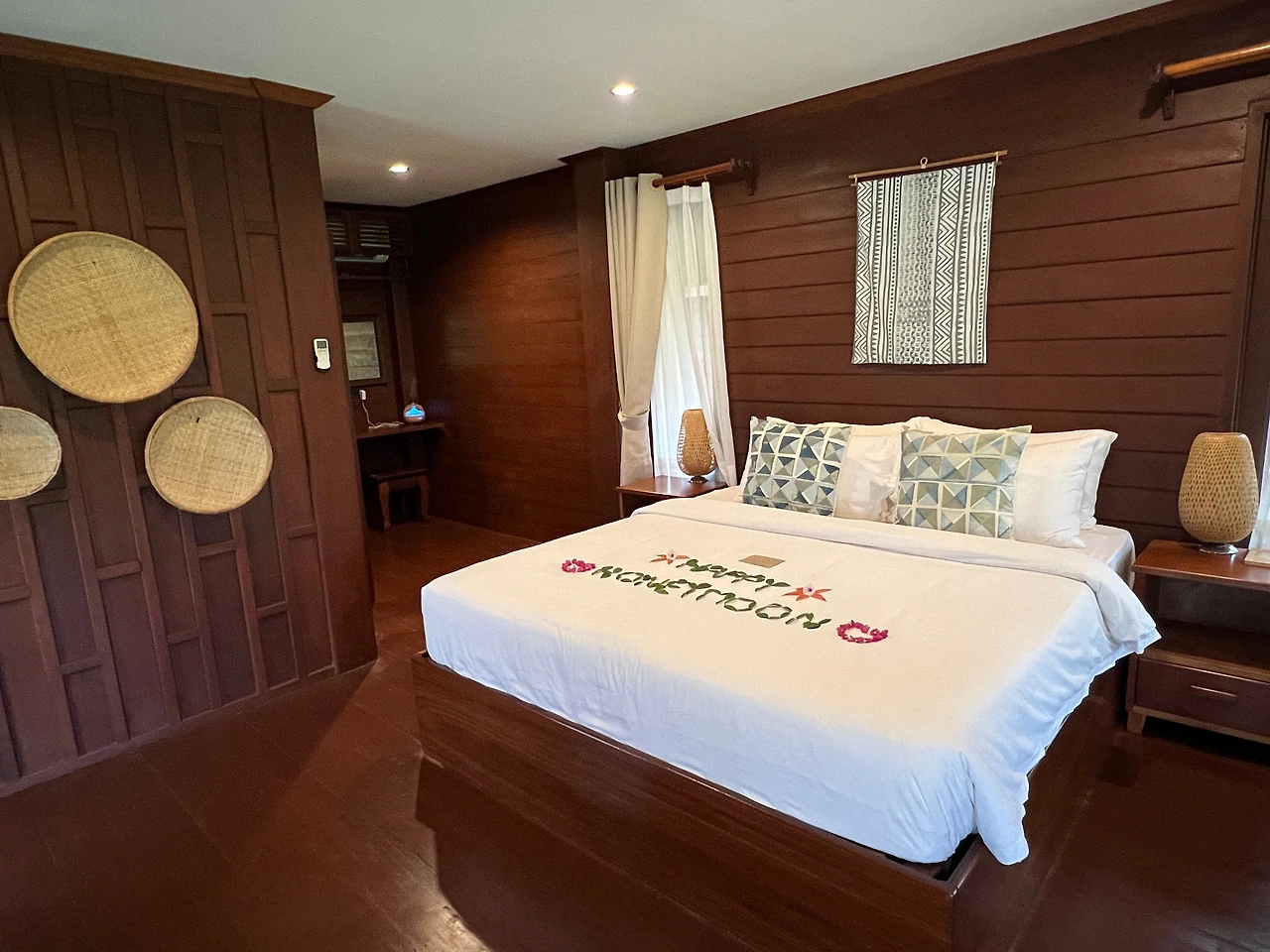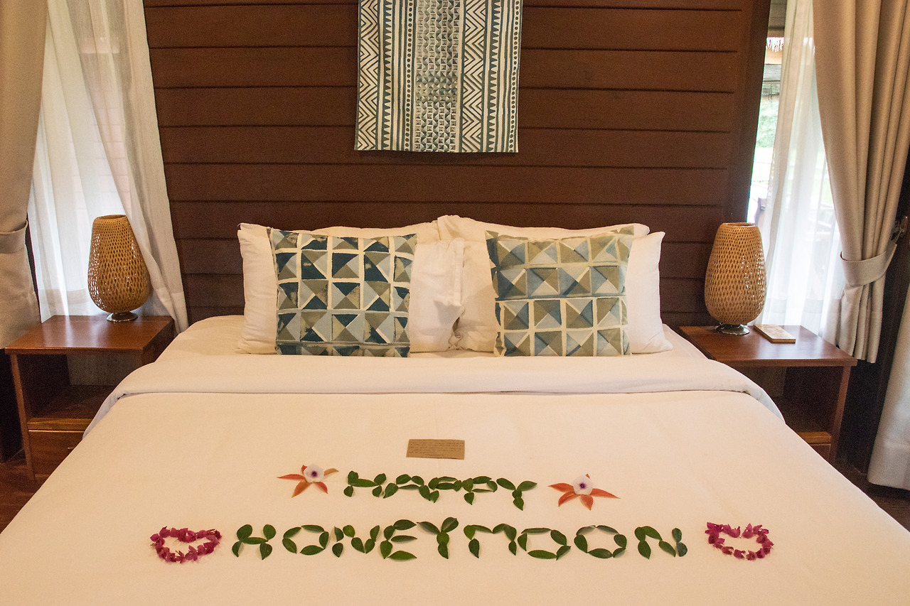 당최 들어갈 생각을 안 하는 신혼부부를 끝까지 재촉하지 않고 미소를 유지하며 기다리고 있는 인내심 만렙의 안내 직원과 눈이 마주쳤다. 미안하고 고마운 마음에 그제야 방으로 들어갔다. 들어가자마자 가장 먼저 눈에 들어온 건 침대. 침대 위에는 나뭇잎과 꽃잎들로 만든 *HAPPY HONEYMOON* 이라 쓰인 웰컴 멘트와 함께 매니저의 자필 편지가 놓여있었다. 별 대수롭지 않게 생각하고 계속해서 직원의 숙소 안내에 집중했다. 그사이 유튜브를 찍고 있던 아내가 뒤늦게 따라 들어왔다.