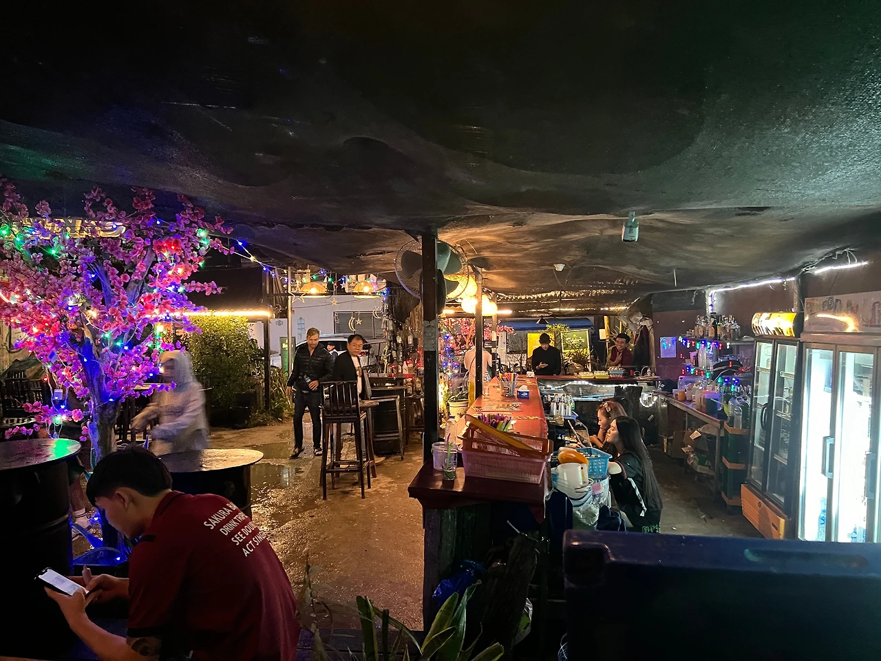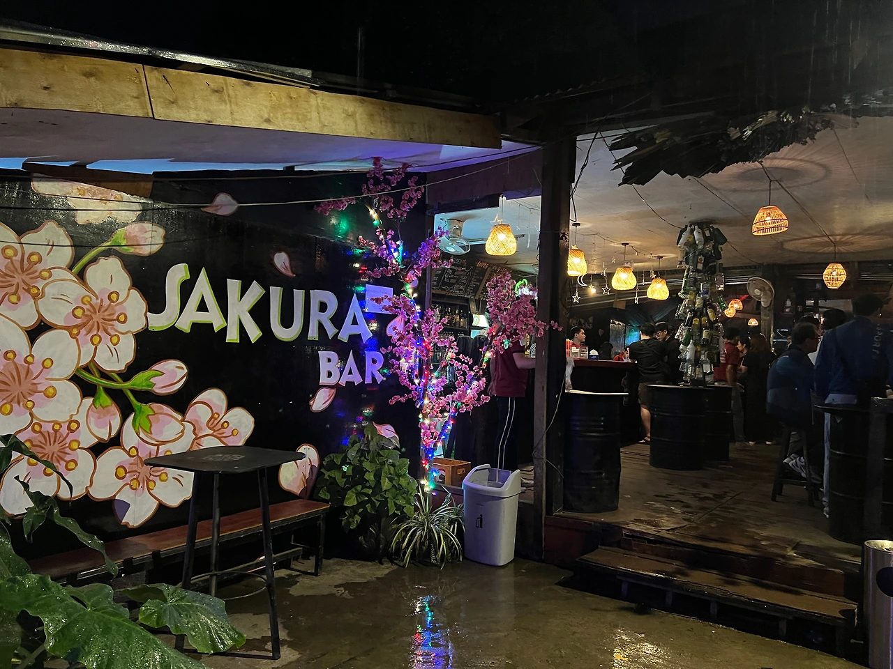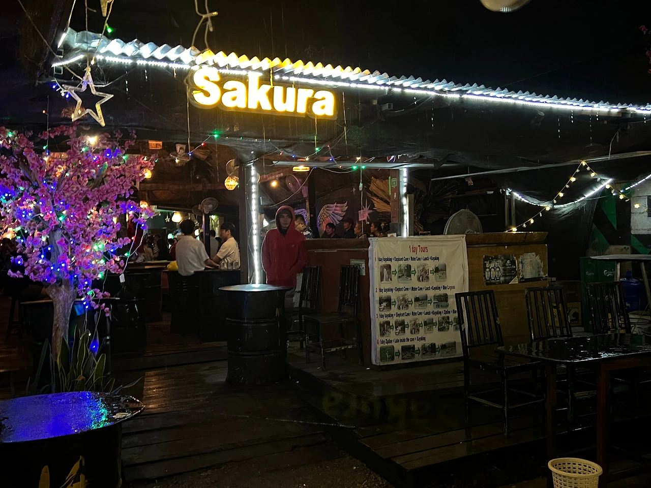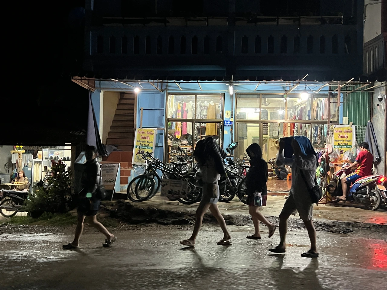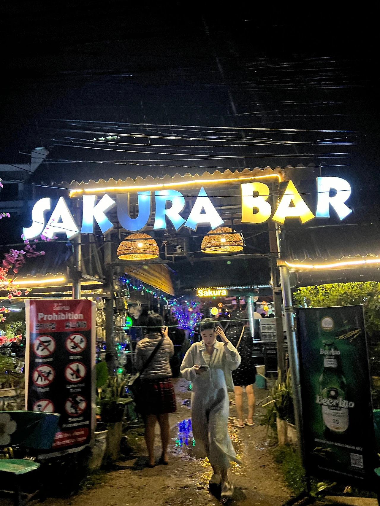 사쿠라바는 방비엥 야시장에서 두 블록 옆, 걸어서 5분이면 갈 수 있는 거리였지만 시간이 살짝 이르기도 했거니와 야시장 쇼핑으로 퀴퀴해진 몰골과 드레스코드 정비를 위해 일단 숙소로 돌아가 짧은 충전의 시간을 갖기로 했다. 올 때는 걸어왔지만 깜깜한 밤인 데다 마침 비까지 스멀스멀 내리기 시작해 툭툭이를 타고 가기로 했다. 그런데 야시장 주변에 정차 중인 툭툭이가 많아 손쉽게 잡을 수 있을 줄 알았건만 대부분 이미 기다리는 손님이 있거나 운행을 하지 않는 툭툭이였다. 어플로도 잡아보려 했지만 우리 숙소가 여행자 거리와는 반대편에 있어 그런지 기사들이 좀처럼 들어가고 싶어 하지 않는 것 같았다. 시간은 계속 흘러만 가고 비는 점점 거세지고 있어 결단을 내렸다. 청춘스럽게 옷을 뒤집어쓴 채 비 맞으며 걸어가기로. 숙소까지는 약 1km. 충분히 걸어볼 만한 거리였다.