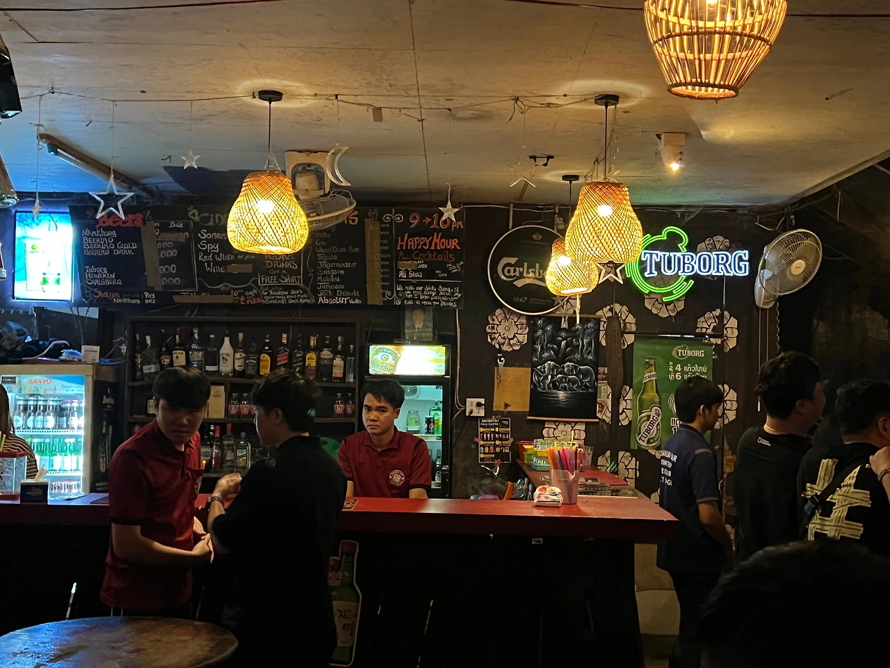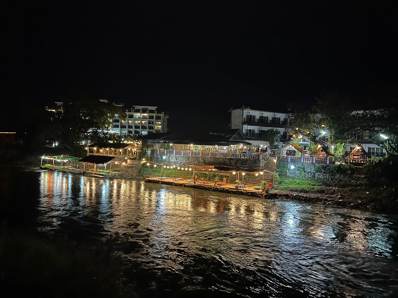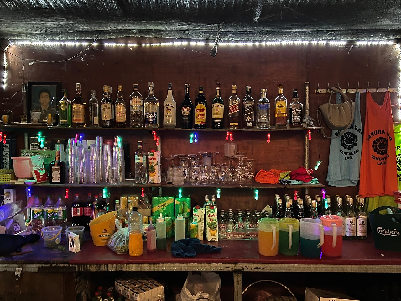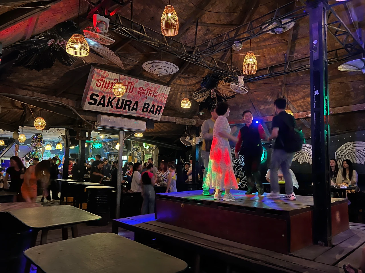 노래가 끝나고 클로징 멘트와 함께 피크를 찍었던 분위기도 차츰 내려앉았다. 함께 어깨동무를 했던 외국인 친구들과도 아쉬운 작별인사를 하고 헤어졌다. 사쿠라바에서 친해진 사람들끼리 2차를 가기도 했는데 우리도 이대로 가기는 살짝 아쉬웠지만 툭툭이 기사와의 약속된 시간(돌아가는 시간까지 주변에서 기다리고 있기로 했다)이기도 했고, 무엇보다 마음과 달리 몸은 더 이상 놀 체력이 남아있질 않았다. 육탄전이 예상되는 다음날 여행일정도 고려해야 하니 아쉽지만 방비엥에서의 광란의 밤은 여기까지 하는 걸로...