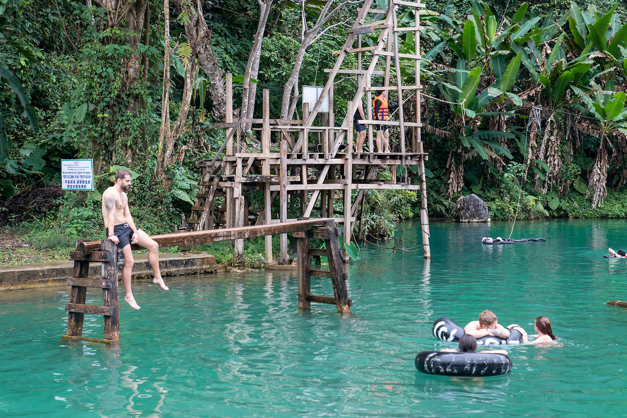 사실 다이빙은 그다지 하고 싶지 않았다. 짚라인과 비슷한 높이이기는 하나 손잡이를 잡고 떨어지는 것과 스스로 허공에 몸을 날린다는 건 180도 다른 이야기니까. 하지만 열화와 같은 성원(이것 역시 독촉)과 유튜브 영상을 위해 이 한 몸 바치기로 하고 다이빙대에 올랐다. 1차 시기, 실패. 후~ 호흡 한 번 크게 가다듬고 2차 시기, 읍! 첨벙! 역시나 끝나고 나니 별거 아니었다. 하지만 굳이 또 하고 싶지는 않았다. 이제 나가서 뚝배기라면에 비어라오나 한잔해야겠다 싶었는데 이런, 고프로 렌즈가 앞을 바라보고 있는 것 아닌가?! 찍으려던 건 내가 나오는 1인칭 시점의 다이빙 영상이었는데. 어쩔 수 없이 난 다시 다이빙대로 직행했다. 이번엔 렌즈를 내 쪽으로 바꿔놓고, 첨벙! 책임감 있게 임무를 완수하고 물 밖으로 헤엄쳐 가고 있는데 또다시 들려오는 아내의 (검은) 목소리.