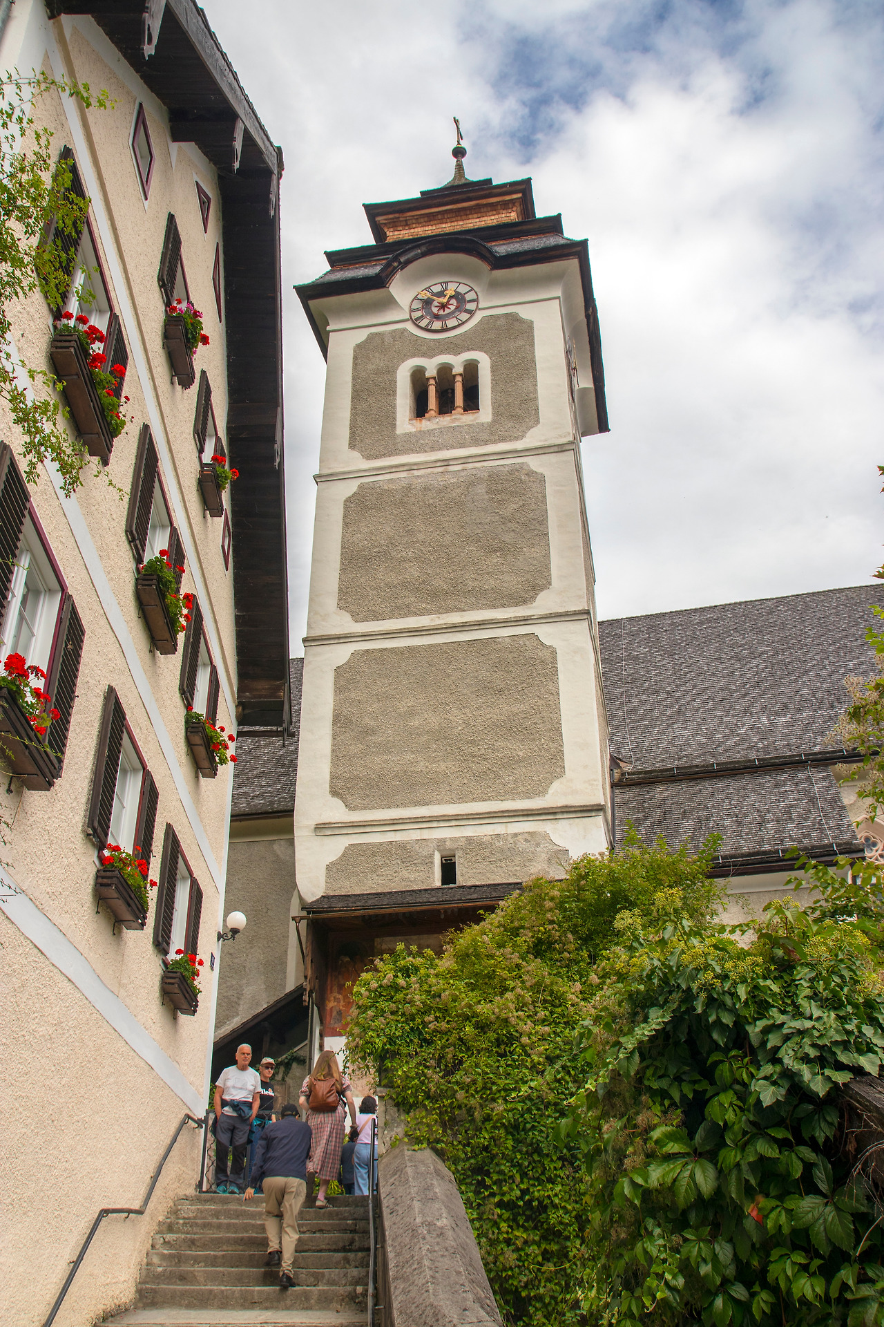 광장 초입 바로 앞에는 개신교 교회가 있다. 바로 흔히 아는 달력 속 할슈타트에 등장하는 그 교회다. 제법 크고 높아 가까이서는 제대로 담기가 어렵다. 성모승천 성당에서 납골당으로 올라가는 옆길이 뷰포인트다. 지대가 높아 산과 호수를 배경으로 교회 전체와 첨탑을 모두 담을 수 있다.