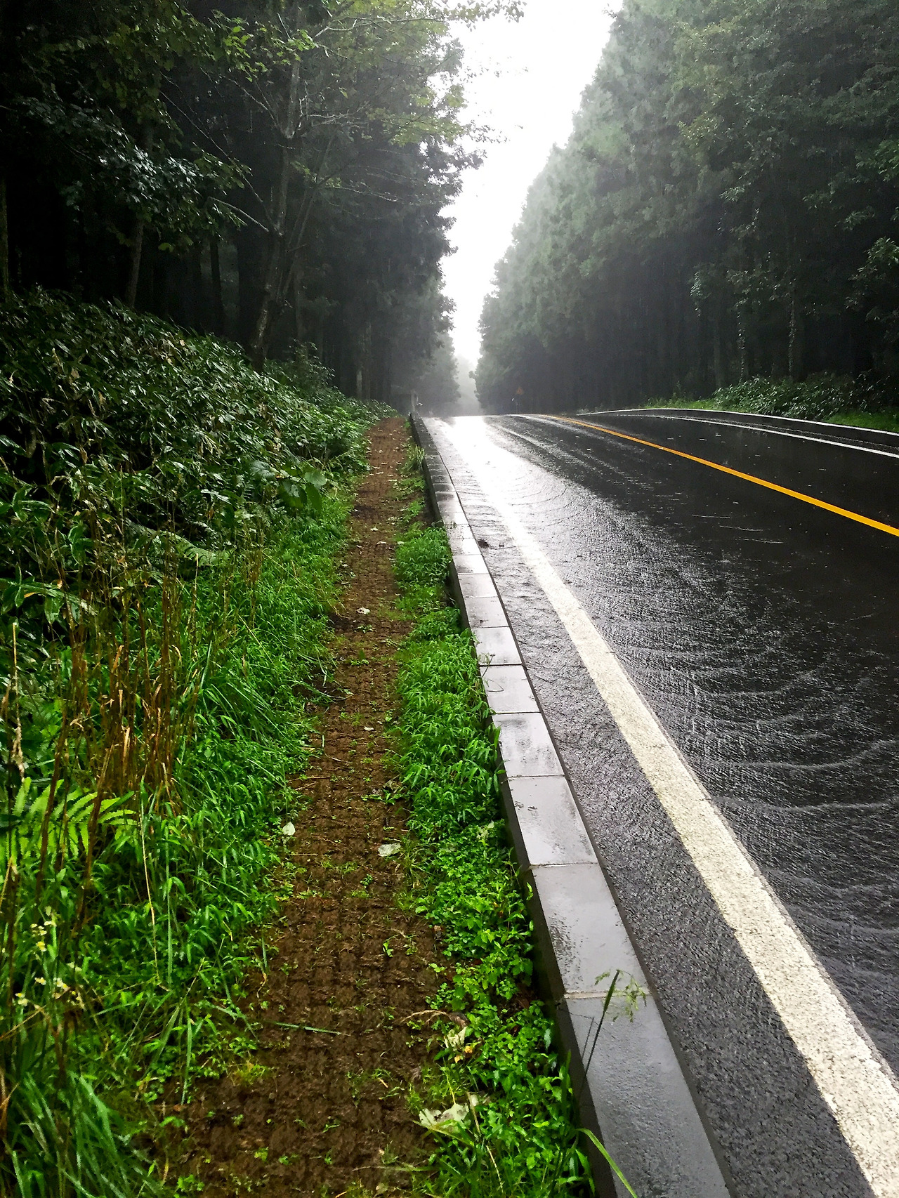 주차장으로 질러가기 위해 숲길에서 나와 도로가 옆으로 걸었다. 오르락내리락 고저 차이가 큰 사려니숲의 주변 도로는 거의 계곡 수준으로 물이 흐르고 있었다. 물도 물이지만 바로 옆으로 쌩쌩 달리는 차들이 더 신경 쓰였다. 아니나 다를까 차 한 대가 물벼락을 선물해주고는 유유히 지나갔다. 비벼락에 물벼락까지 맞은 내 모습을 보곤 엄마는 깔깔 웃었다. 그리고는 이렇게 비를 맞으며 걸어 본 게 언제인지 모르겠다며 잠시 옛 추억을 되새기는 것 같았다.