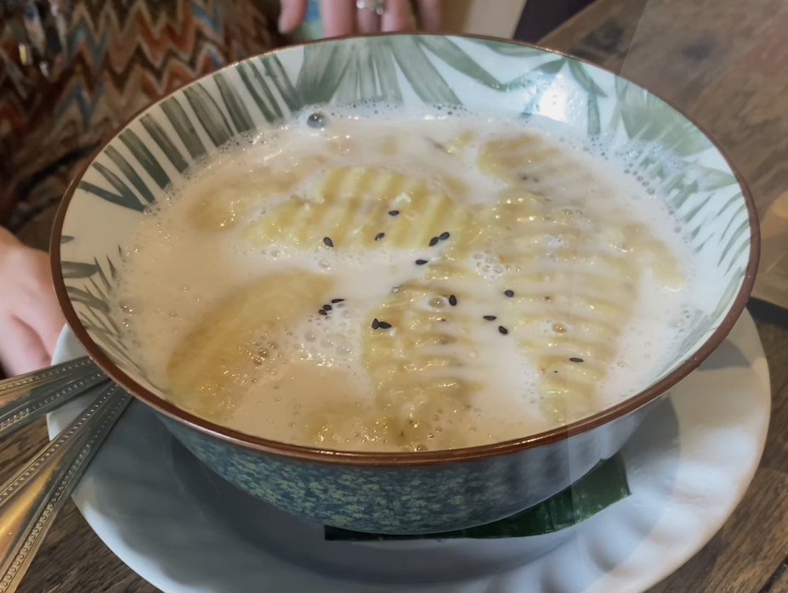 사실 처음엔 기대가 크지 않았으나, 한 입 먹는 순간 우리는 깜짝 놀랐다. 신선한 망고랑 짭짤한 소스, 그리고 스티키 라이스. 게다가 에바가 시킨 코코넛 스프와 바나나는 따뜻하게 데워져 나오는 디저트였는데 한 여름 날씨 방콕에서 먹어도 결코 거부할 수 없을 안락한 맛이었다.