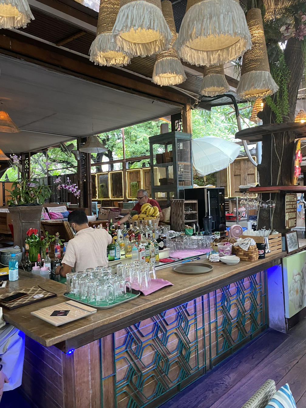 <마담 무써>는 오픈형 가게로 앉아서 밖을 바라볼 수 있고, 입구에 들어서면 초록색의 다양한 식물과 멋진 분위기의 바가 먼저 환영해 준다. 그 덕분에 여행지에 온 기분을 최고조로 느낄 수 있는 곳이라 믿는다. 우리는 조금 지친 기분이었는데, 이곳에 와서 매우 들뜨고 행복해했던 기억이 난다.
