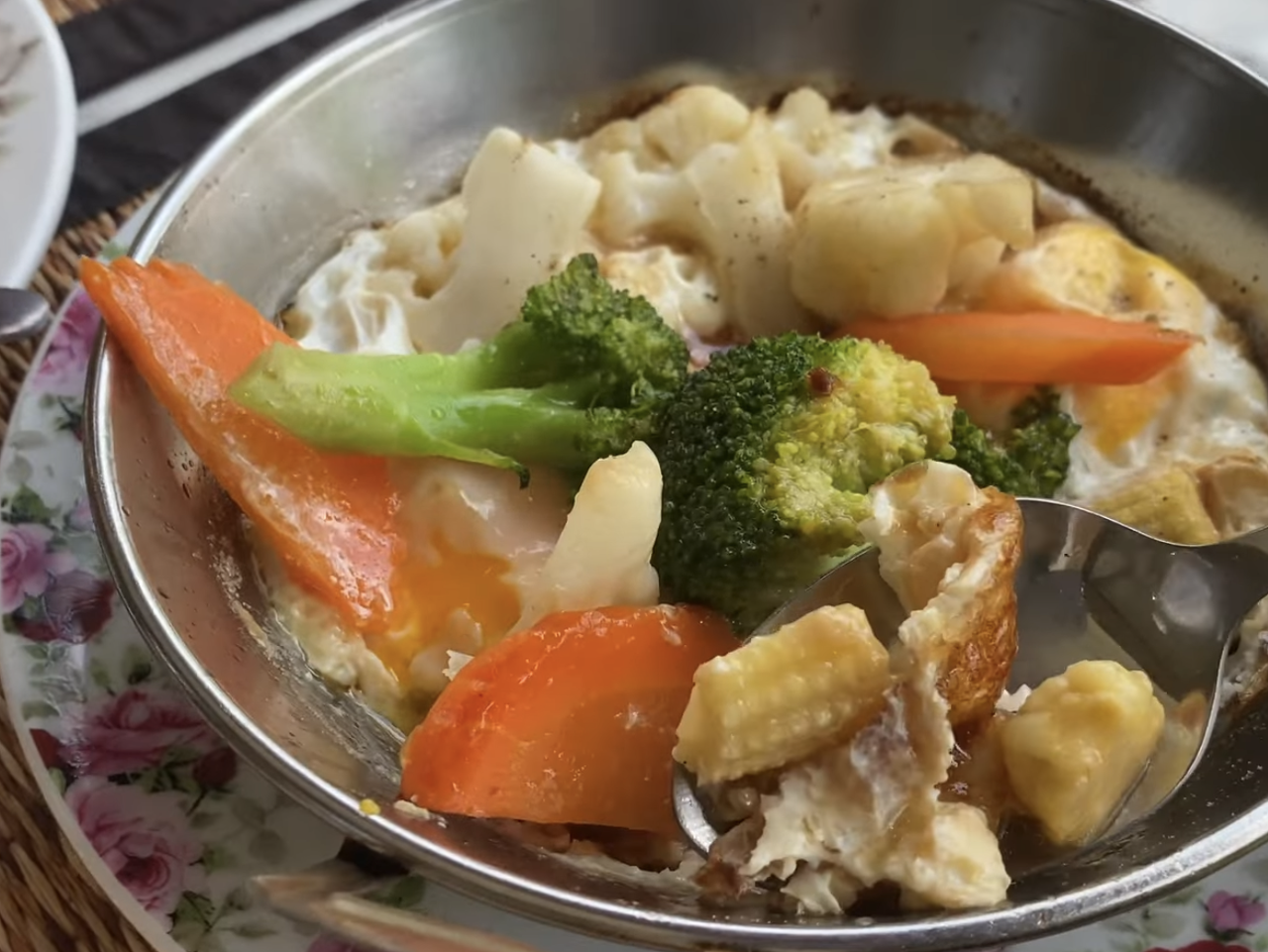 베지터블 옵션을 선택했더니 고기가 없는 야채로 구성된 요리가 식빵과 함께 나왔다. 그렇지만 계란은 기본이니 비건은 아니다. 단맛이 강한 요리로 흥미로운 맛이었다. 태국에 가면 다른 카이 크라타를 시도해보고 싶다.