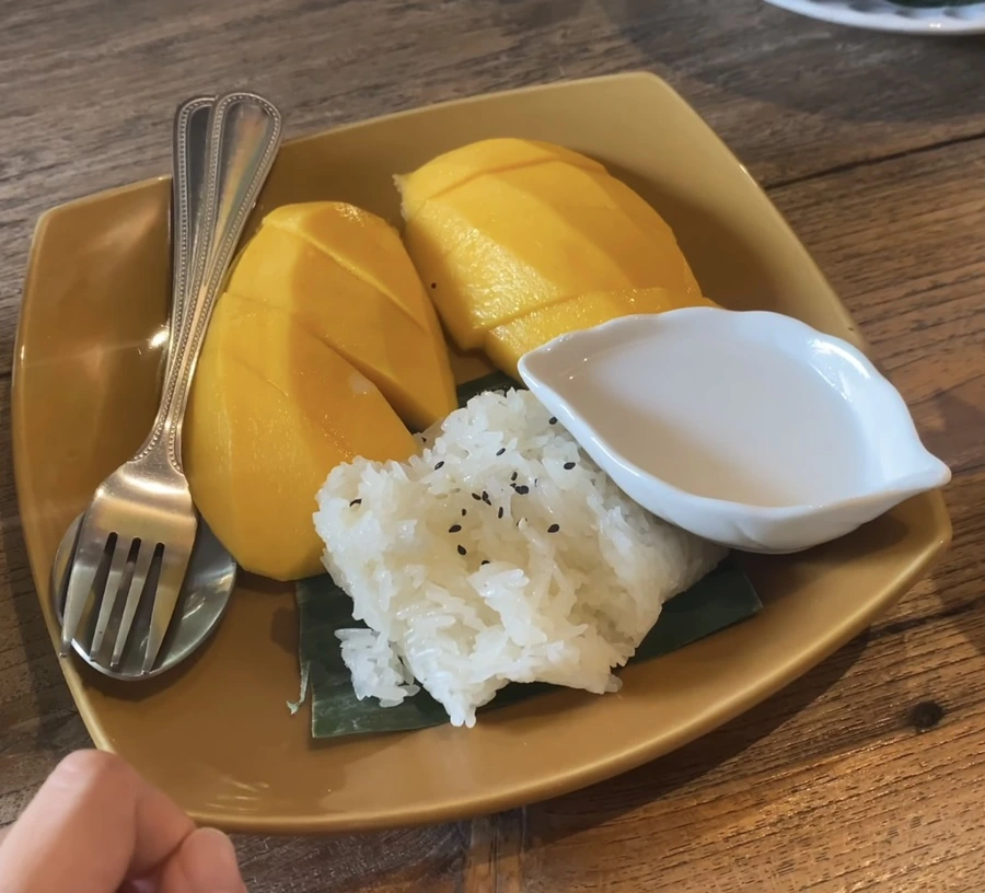 코코넛 소스를 스티키라이스에 뿌리고 망고와 함께 먹으면 된다. 그걸 모르고 망고를 그냥 소스에 찍어먹었는데 태국 친구들에게 혼났다.