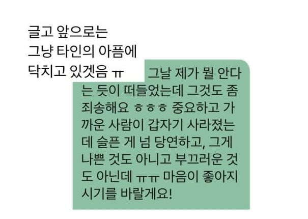 최근에는 몇몇에게 뒤늦은 사과를 했다. 한 달 남짓한 시간 동안만 4번 헤어지고 그 사람을 다시 만나는 친구에게, "네가 그러면 날 사랑하지 않는 것처럼 느껴져"라고 하자 "네가 그렇게 느낀다면 내가 널 사랑하지 않는가 보네"라면서 관계를 단칼에 끝낸 상대 때문에 상심하는 이에게.