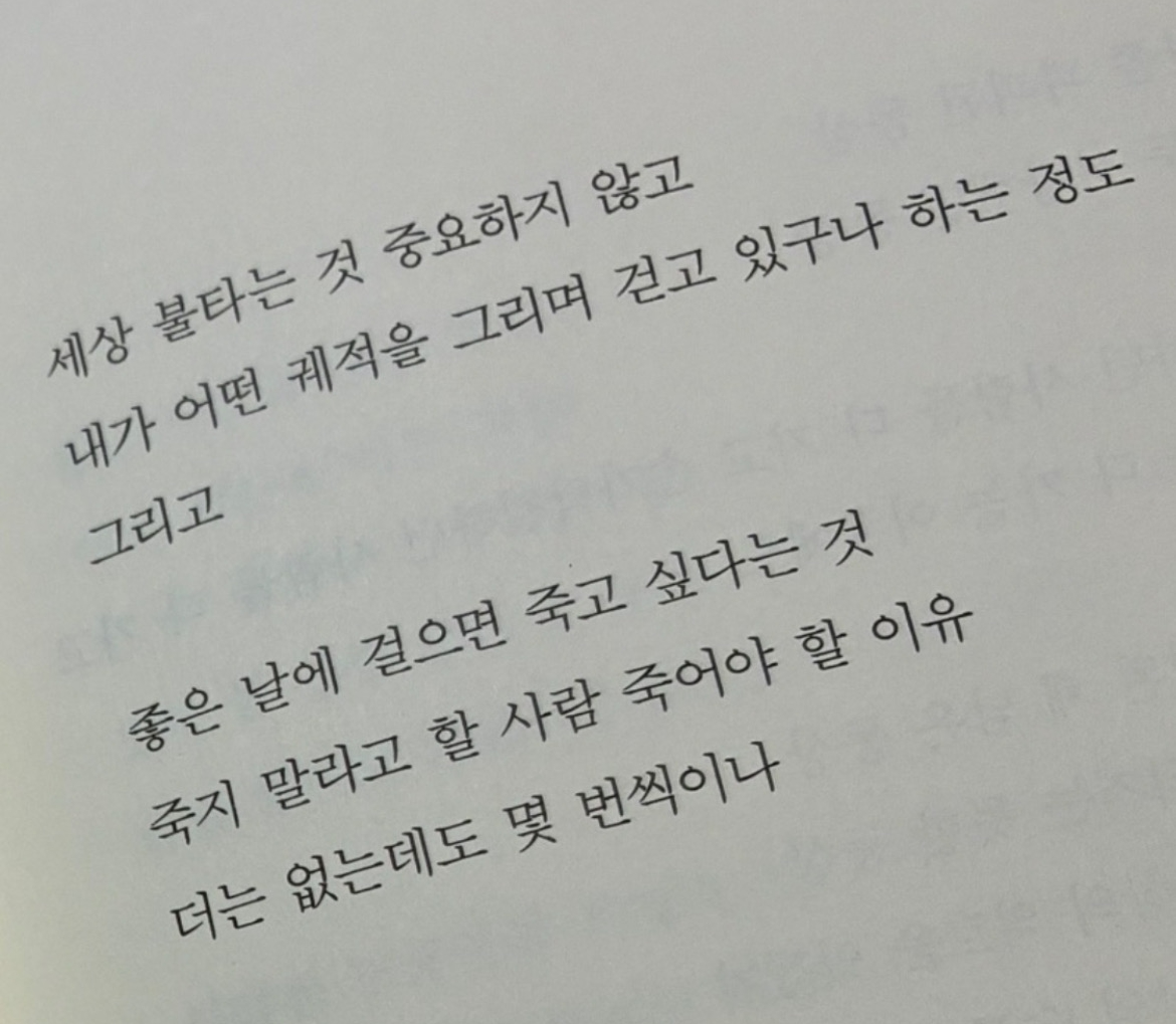 좋은 날에 걸으면 여전히 죽고 싶다. "죽지 말라고 할 사람"도, "죽어야 할 이유"도 없는데 말이다. 이 마음을 표현하자고 진짜로 세상이 불타고 있는데 "세상 불타는 것 중요하지 않고"라고 할 수는 없다.