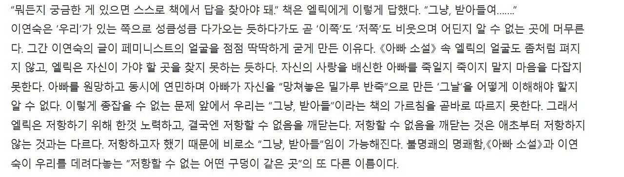 저항할 수 없음을 깨닫는 것은 애초부터 저항하지 않는 것과는 다르다. 저항하고자 했기 때문에 비로소 "그냥, 받아들임"이 가능해진다.