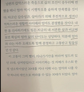 수치심을 무릅쓰고 엄마 이야기를 썼다. 적어도 나에게는 꽤 큰 용기가 필요한 일이었는데 왜냐하면 그간 엄마가 나의 약점이라 생각했기 때문이다. 엄마는 나에게 불우한 10대를 선사한 가해자이자 자기 인생의 피해자였고, 삶이 고통으로 이루어졌단 사실을 알려준 사람이자 동시에 삶의 의미를 발견할 수 있는 지적 호기심을 선물해 준 사람이었다. 이 복잡한 실타래를 풀어보자는 마음으로 썼다.