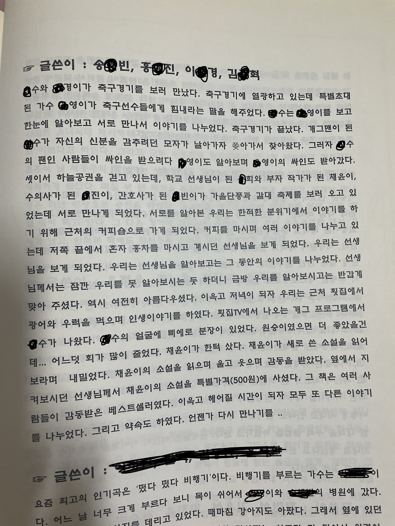 우리들의 미래 모습에 대한 소설도 적었다. 1조가 2조의 미래를 쓰고, 2조가 3조의 미래를 쓰는 방식이었는데, 이 소설 속의 나는 베스트셀러 부자 작가가 되어 선생님께 새로 나온 소설을 특가(500원)에 드리고 있다. 비록 글을 써서 번 돈은 없지만... 나름 친구들이 써준 소설과 비슷한 삶을 살고 있는 것 같아 기분이 좋다.