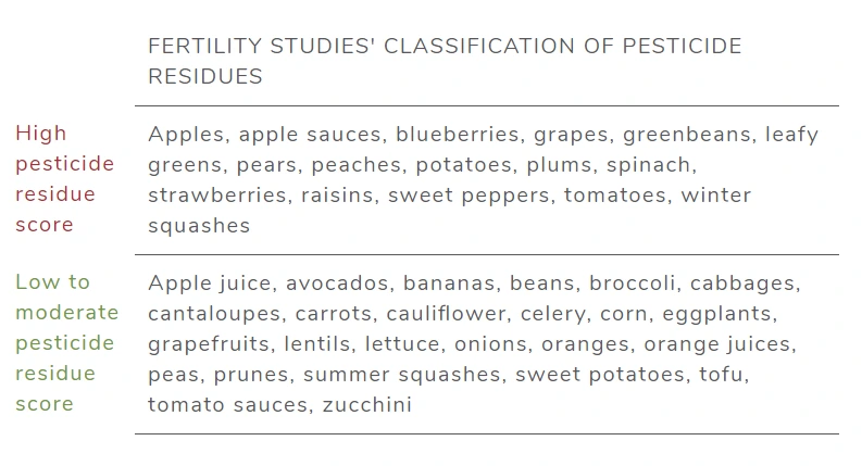 - 농약 잔류물이 낮거나 적정량인 작물: 사과주스, 아보카도, 바나나, 콩류, 브로콜리, 양배추, 칸탈롭스 (멜론과 과일), 당근, 콜리플라워, 셀러리, 옥수수, 가지, 자몽, 렌틸, 양배추, 양파, 오렌지, 오렌지 주스, 콩, 프룬, 애호박, 고구마, 두부, 토마토소스