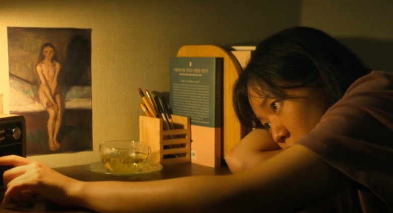 외모 때문에 놀림당하고, 세상 밖으로 밀려나서, 자기 자신을 부정하며 살아온 사람. 미정이 머무는 공간은 늘 어둡잖아요. 손을 흔들어야 겨우 불이 켜지는 지하 창고. 뭉크의 그림 속 소녀처럼 어둠 속에 웅크리고 앉아 있는 거예요. 뒤에 드리워진 그림자는 미정이 평생 안고 살아온 불안 그 자체입니다. 나는 사랑받을 수 없는 사람이라는, 나는 없는 사람이라는 그 어둠이요. 미정이 어떤 상태에 있는 사람인지를 말 한마디 없이 보여주는 거예요. 그리고 이 그림 앞에서 드뷔시의 아라베스크가 흘러나옵니다. 라디오에서요. 그 몽환적이고 아름다운 선율이 이 불안한 소녀의 방에서 울려 퍼진다는 것. 어둠 속에 있지만 그 안에 아름다운 내면이 숨어 있다는 걸 동시에 보여주고 있는 겁니다.