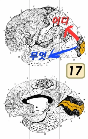 시각 피질은 (브로드만 분류) 뇌피질 17 구역에 있다. 시각 정보는 나누어져 위치는 두정엽, 정체는 측두엽에서 파악한다.