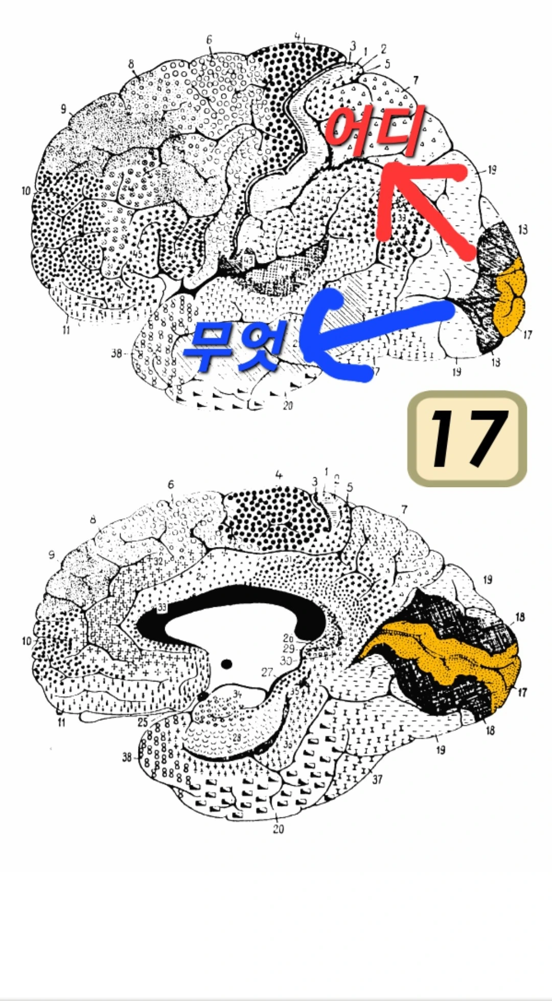 대상 이미지를 해석하는 데는 두 가지 측면이 중요하다. 하나는 어디에(where) 있는 무엇(what)인가? 위치에 관한 정보는 두정엽으로 가면서, 정체에 관한 정보는 측두엽으로 가면서 추출된다. 두정엽(頭頂葉)으로 가는 길을 dorsal pathway, 측두엽으로 가는 길을 ventral pathway 라 부른다.