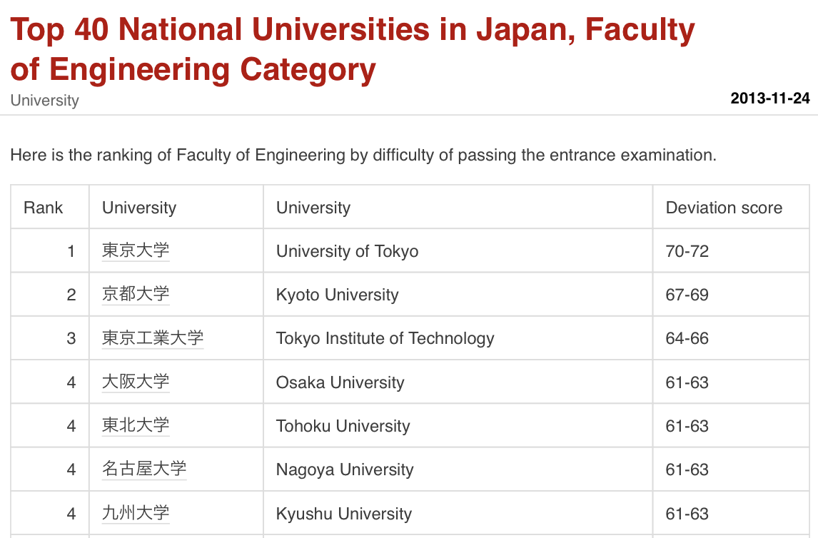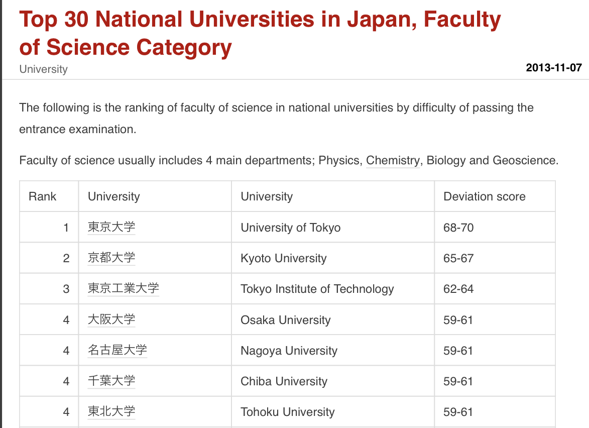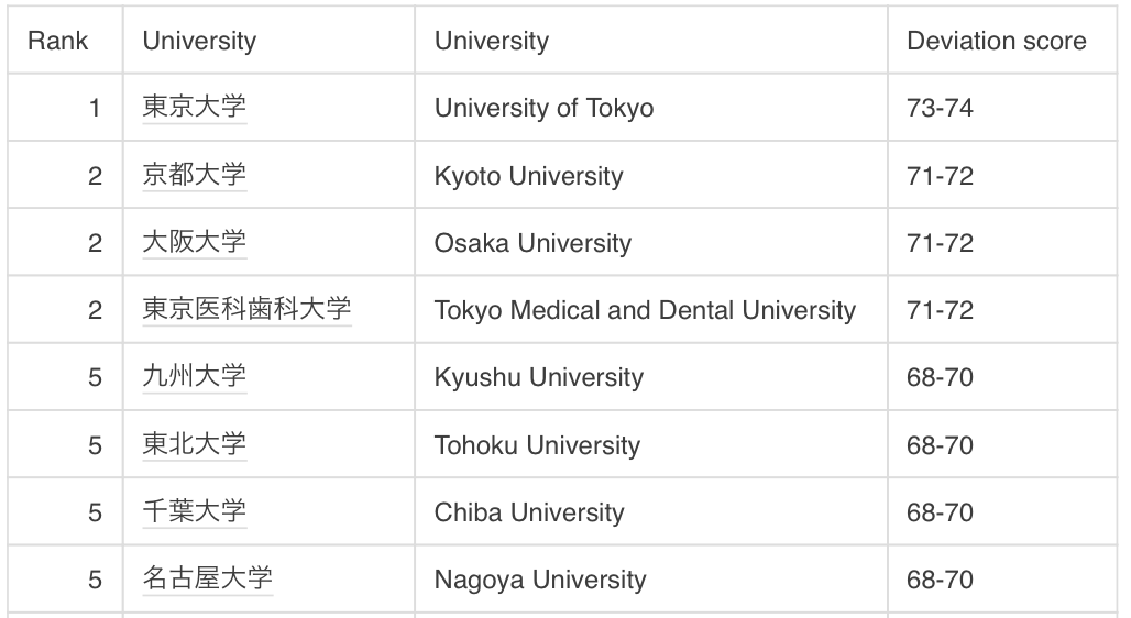 아래 일본 수능 점수들은 사립고등학교 입학에 전혀 반영되지 않기 때문에 게이오대, 와세다대 등의 명문사학들이 순위권에서 빠져있는 것을 감안하고 살펴보아야 한다. 동경 사람들의 게이오대 선호도는 교토대, 오사카대와 비슷한 수준이다.