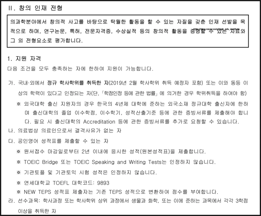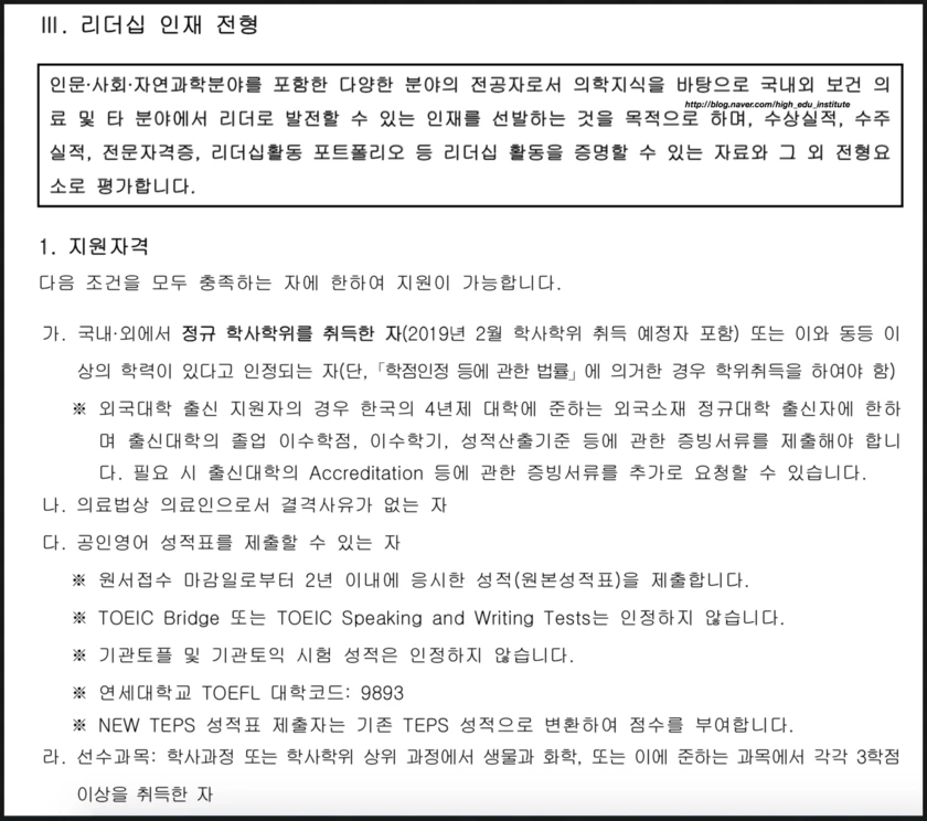 연대의대 편입전형에는 일반전형, 리더십/창의 전형이 있다. 입시요강은 다음과 같다!