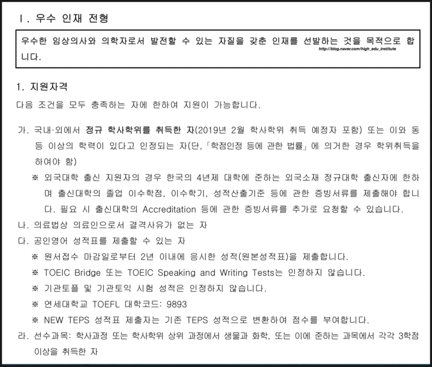 연대의대 편입에 대해 자주 들어오는 질문에 대한 답변을 중심으로 풀어보려 한다. 연대의대와 서울대치전원에 합격한 경험과 편입학 스터디 및 컨설팅 경험을 바탕으로 작성하였으나 지극히 주관적일 수 있다는 사실을 밝힌다. (설대 치전원은 다음시간에)