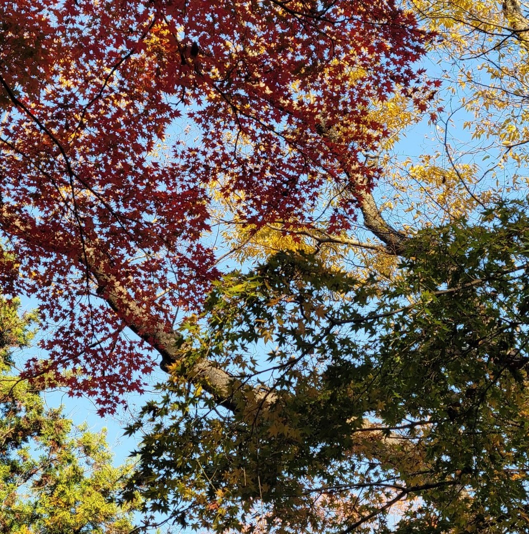 무르익은 붉은 단풍과 아직은 푸릇 잎이 맞닿은
