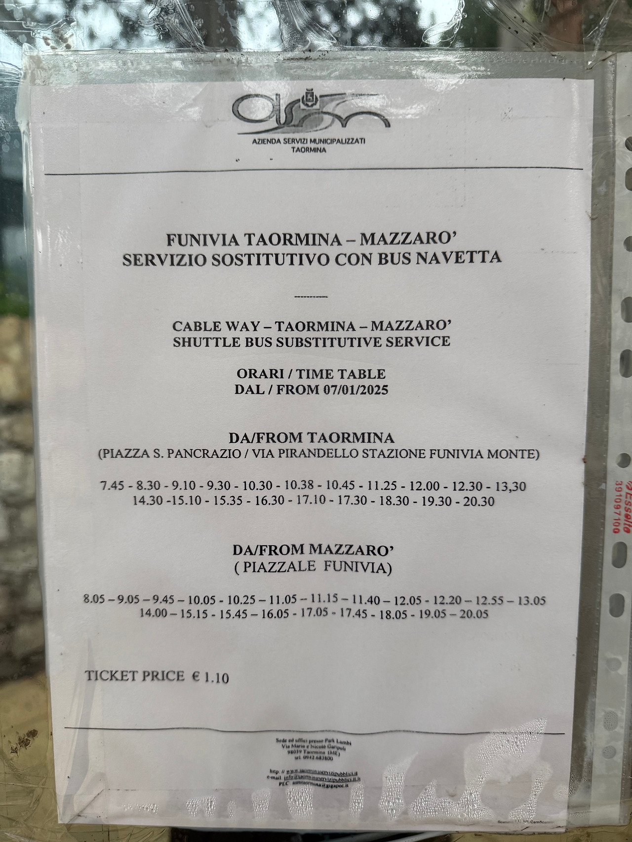 그런데 지금은 비수기다. 케이블카 쪽에 가니 운영하지 않는다고 한다. 아니, 비수기라고 케이블카까지 운영하지 않는 건 잘 이해가 되지 않았다. 1킬로 정도 내려가면 버스를 탈 수 있다는 표시가 있었다. 티켓은 1.1유로에 시간당 1,2회 운영 중이었다. 우리는 타오르미나를 떠나 시라쿠사 쪽으로 가는 일정이라 차로 가기로 했다. 주차장은 케이블카 아래 정류장에 공영주차장. 성수기에는 들어올 엄두도 나지 않는다는 그 주차장에 홀로 주차하다.