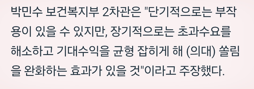 - 필수의료를 기피하는 이유인 "의사 내 상대적 임금 격차, 삶의 질 저하, 법적 보호 부재" 세 가지가 해결이 안 되는 이상 증원한 2000명이 필수의료 전문의로 얼마큼 배출될지는 의문이다.