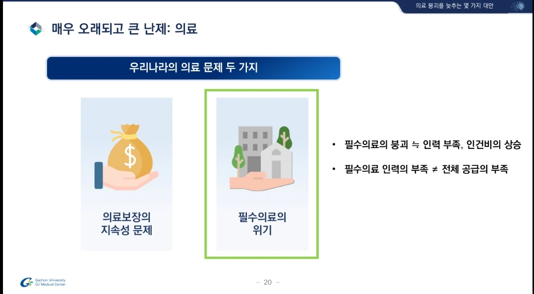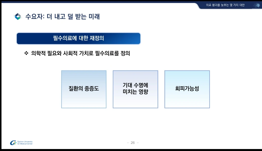 - 우선 위와 같은 현실들을 직시해야 한다. 우리나라 국민들은 더 이상 예전과 같은 정도의 높은 의료접근성과 서비스를 제공받기 힘들 수 있다는 양해가 필요하다.