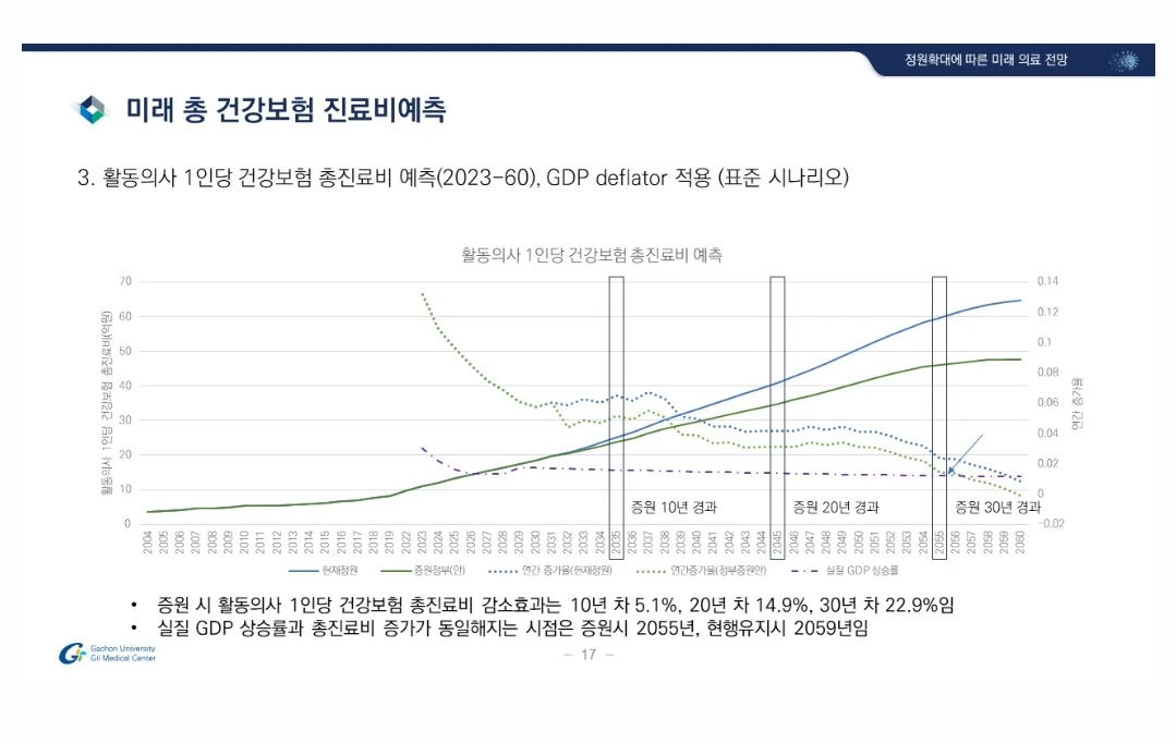 - 의대 증원 효과가 큰 방향으로 가정을 해보았다. 우리나라 경제가 연간 1.1% 이상의 실질 GDP 성장률을 기록하고, 의료비 증가를 보수적으로 산정했다.