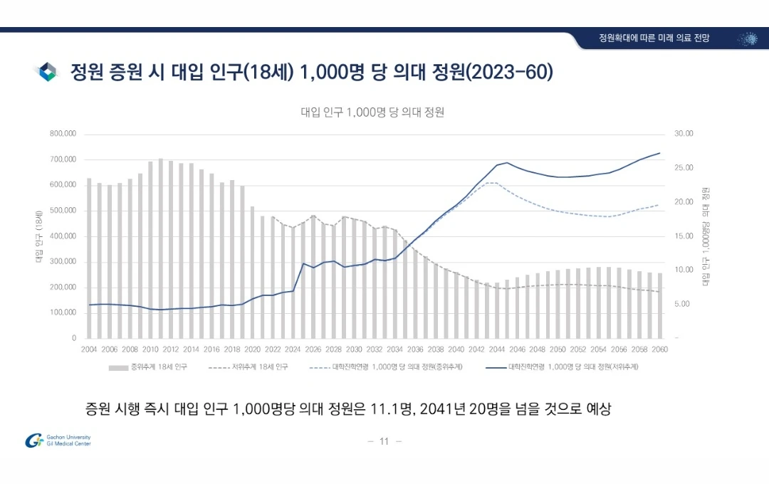 - 의대 증원 즉시 의대 정원은 대입 인구 1000명당 11.1명이 되고, 2040년이 되면 대입 인구 1000명당 20명이 넘게 된다. 그만큼 우수한 인력이 더 많이 의료계로 분배되는 것이다.