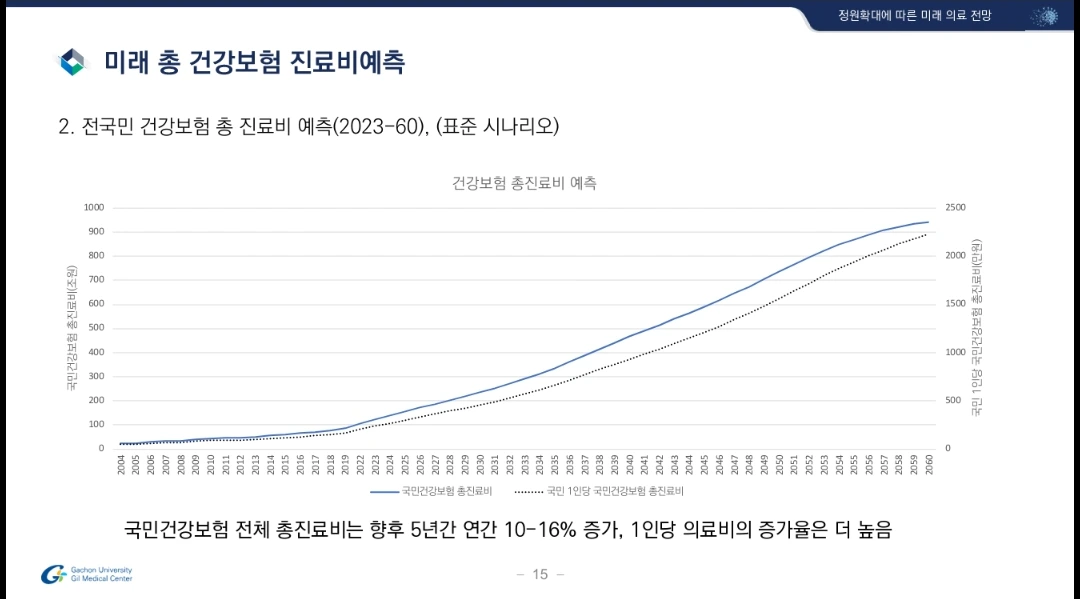 - 현재 경제활동 인구 1명당 1.3명 분의 의료비를 감당한다. 2040년에는 2명 분의 의료비, 2050년에는 2.5명 분의 의료비를 감당해야 한다.