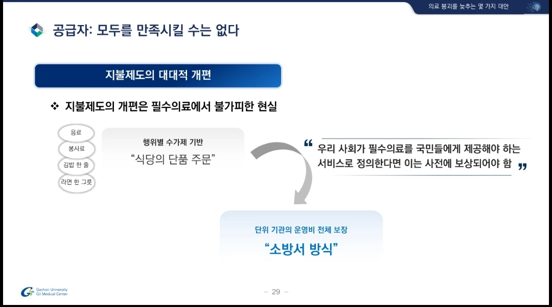 필수의료에 대해서는 소방서처럼 단위 기관의 운영비 전체를 보장하자는 제안.