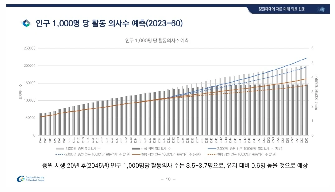 - 증원 10년이 지났을 때 활동 의사 수는 7% 증가, 20년 뒤에는 19% 증가, 30년 뒤에는 약 30% 증가한다.