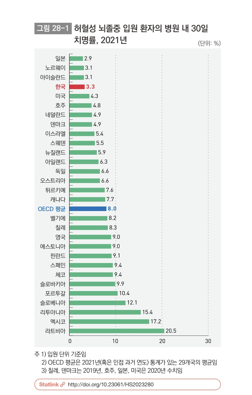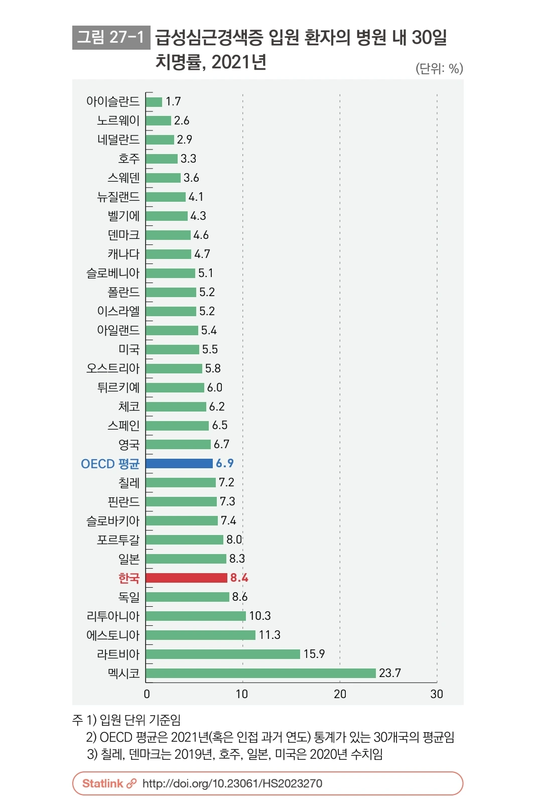 허혈성 뇌졸중 입원 환자의 30일 내 치명률은 OECD 평균 8.0% 대비 3.3%로 매우 낮다. 반면 급성심근경색증 입원 환자의 치명률은 OECD 평균 6.9%에 비해 8.4%로 높은 편이다.