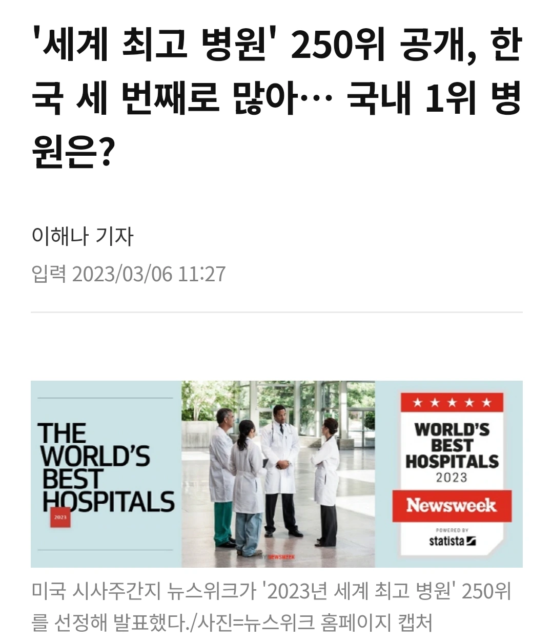 세계 최고 병원 250위 중 우리나라 병원은 18개가 포함되었다. 최고 평가 병원을 3번째로 많이 보유한 나라다.