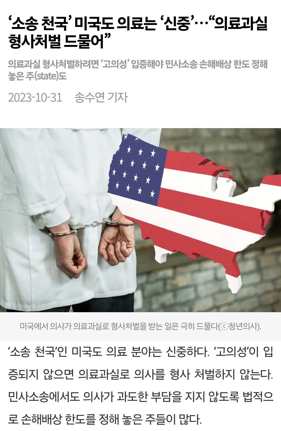 미국도 의사를 형사 처벌하는 것에 대해서는 굉장히 조심스럽다. 물론 민사 소송을 통한 손해배상은 이루어지지만, 고의성이 없는 한 의료과실로 형사 처벌하지는 않는다.