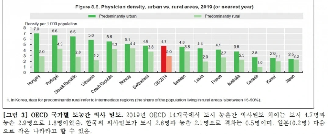 2019년 OECD 평균 도시 의사 밀도는 4.7명, 농촌 의사 밀도는 2.9명으로 의사밀도 차이는 1.8명이었다. 반면 한국은 도시 2.6명, 농촌 2.1명으로 격차는 0.5명으로, 일본(0.2명) 다음으로 적은 수준이었다. 개인적으로 이 통계는 공중보건의와 같이 필수적으로 지방으로 분산되어 있는 의사들이 많이 기여하지 않았을까 생각한다.