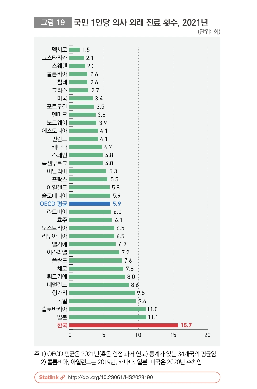 의료접근성이 좋은 덕분에 국민 1인당 의사 진료 횟수는 압도적인 1위(15.7회)다. 물론 의료접근성 한 가지 이유 때문만은 아니다. 전 국민이 가입한 건강보험제도, 그리고 낮은 본인 부담금 등이 합해진 결과다.