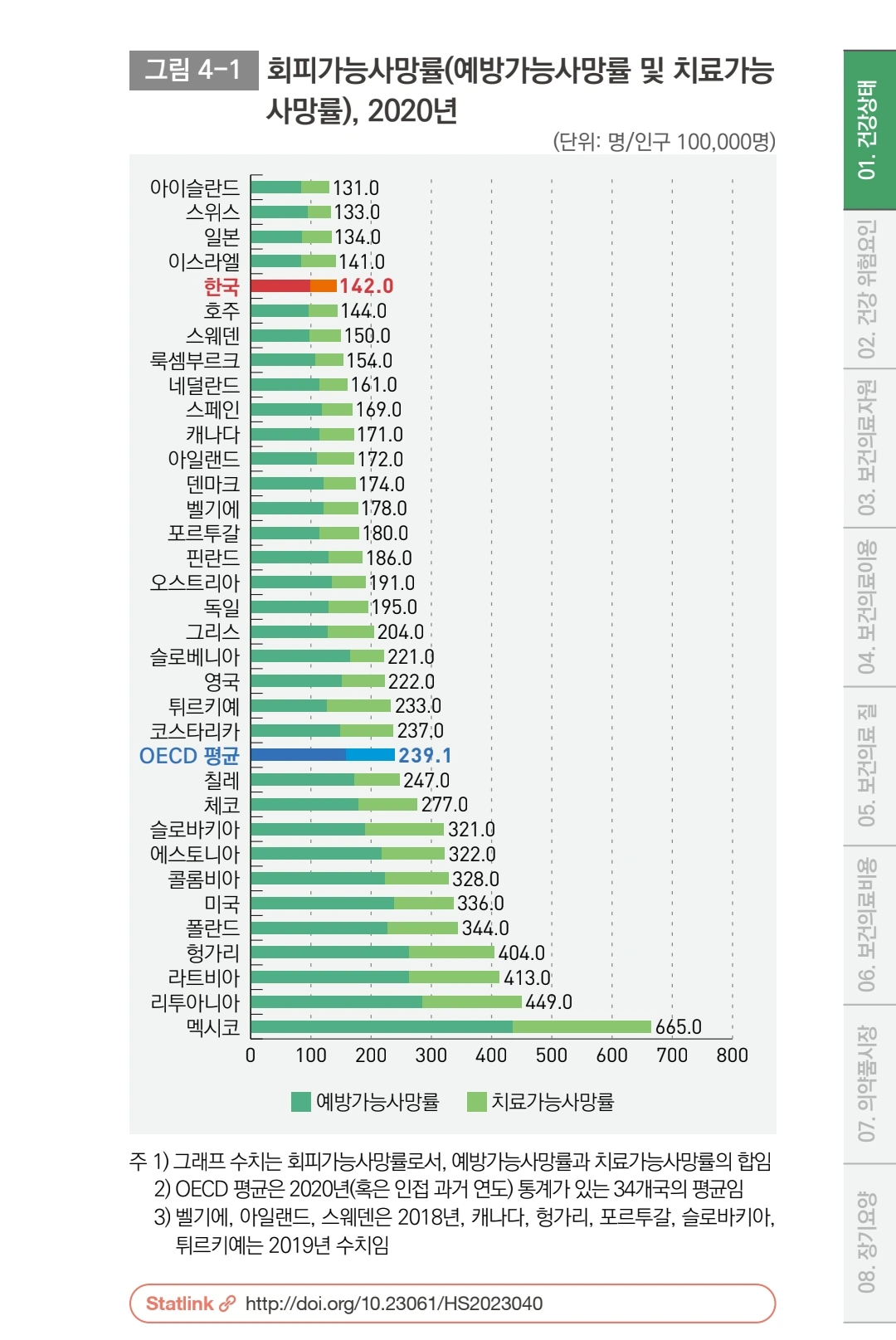 개인적으로 회피가능사망률이 의료 선진국의 제1 척도라고 생각한다. 예방 가능하거나 치료 가능했는데도 불구하고 사망에 이르는 것만큼 비참하고 안타까운 일은 없다. OECD 평균 239.1명 대비 우리나라는 142명으로 40% 낮다.