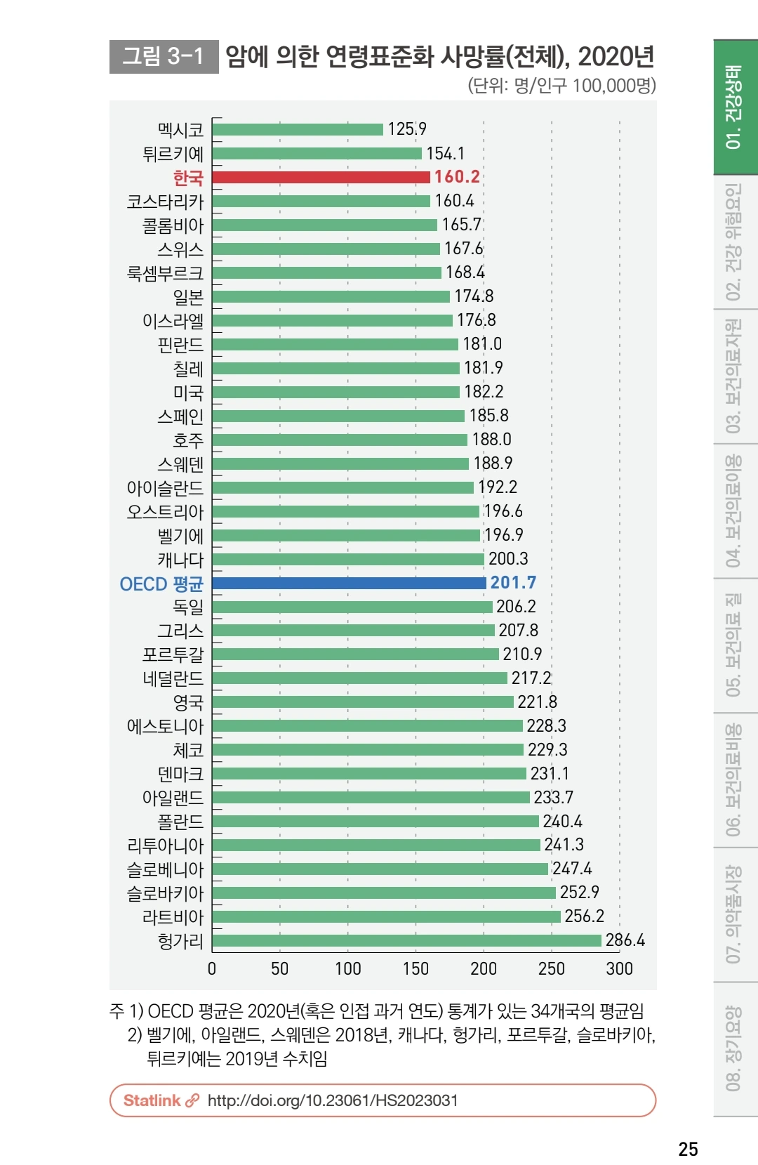 암에 의한 사망률은 OECD 평균 201.7명인데 반해 우리나라는 평균 160.2명으로 21% 낮다.