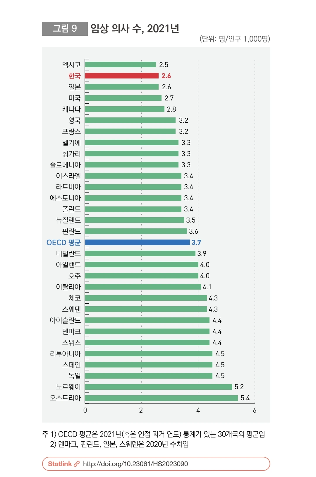 OECD 인구 1000명 당 의사 수는 평균 3.7명이다. 우리나라는 2.6명으로 약 1.1명 정도 부족하다.