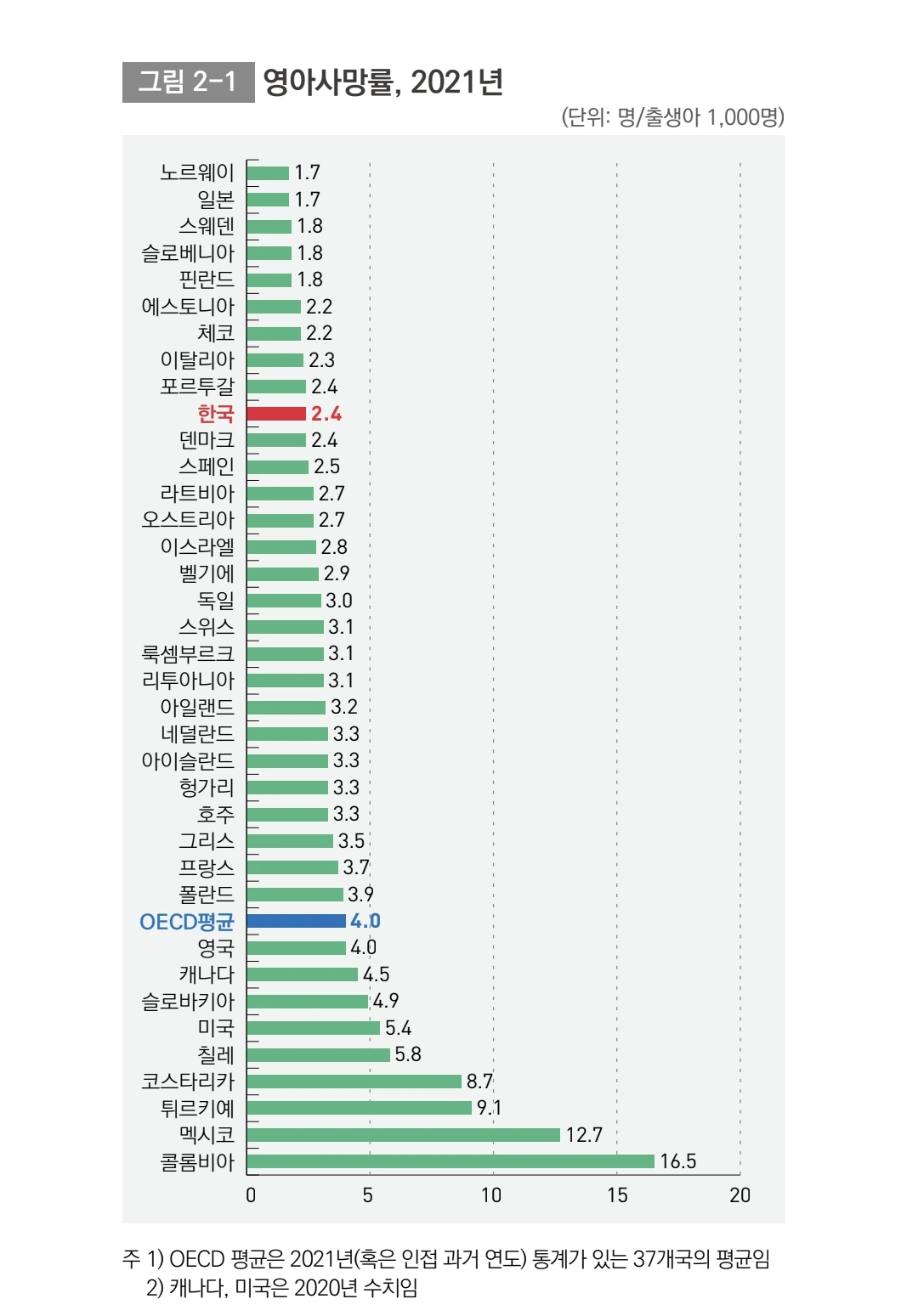 그럼에도 불구하고 우리나라 영아사망률은 OECD 평균 4.0명 대비 2.4명으로 굉장히 낮은 수준이다.