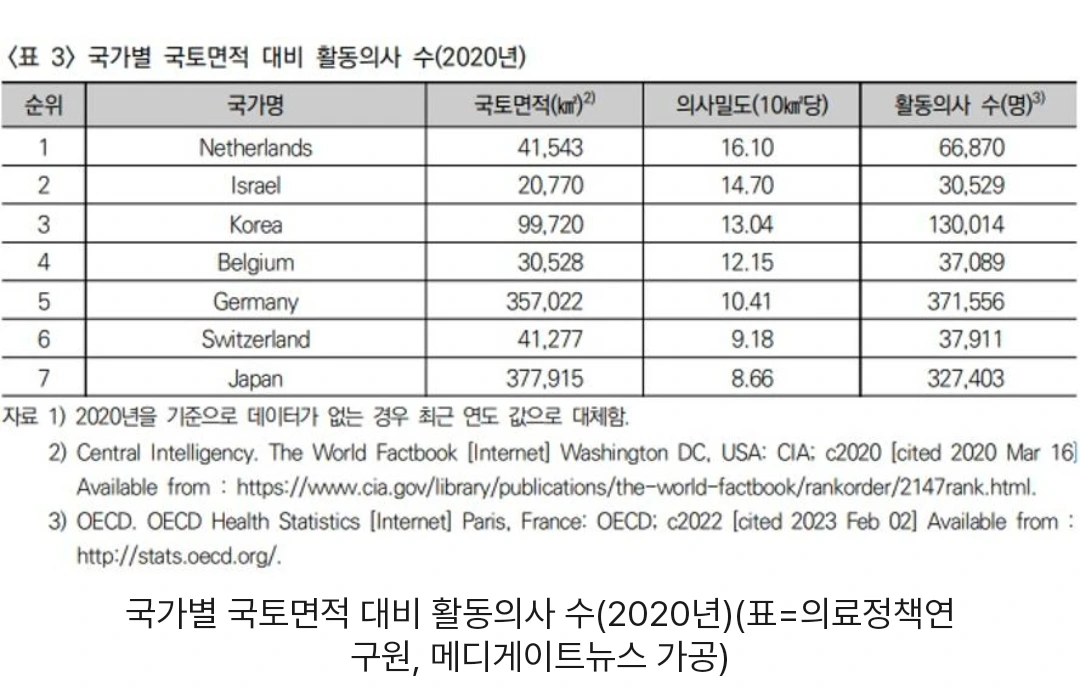 인구 대비 의사 수는 뒤에서 2등이지만, 국토면적 대비 의사 수는 앞에서 3등이다.