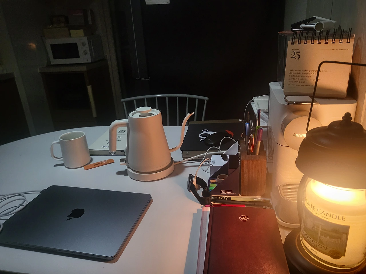아직은 제법 쌀쌀한 거실 공기에 서둘러 커피 포트에 물을 올린다. 유자차, 모과차, 스틱 커피 중에 무엇을 먹을지 고민하며 캔들 워머를 켜고 책상에 앉는다. 주황색 촛불 색이 아늑하다. 단 것이 안 당기는 날에는 따뜻한 스틱 커피를, 약간 배고픈 느낌이 드는 아침에는 유자차나 모과차를 먹는다. 그리고 고요하게 나만의 시간을 갖는다. 어제 다 읽은 책의 독후감을 기록하기도 하고, 책에서 인상 깊었던 구절들을 노트에 필사하기도 한다. 독서는 웬만하면 한 챕터 혹은 두 챕터 정도만 읽으려 한다. 출근하는 길에 곱씹으며 생각하기에 그 이상은 무리기 때문이다.