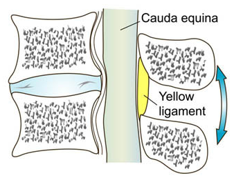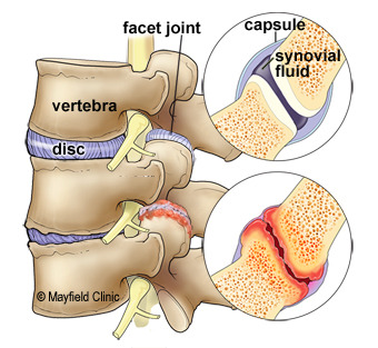 척추에 충격이 가해지면 디스크에서 92%, 후방관절에서 8% 정도 충격을 흡수한다. 디스크가 퇴행성 변화를 겪게 되면 디스크에서 하중을 온전히 흡수하지 못하고 후방관절로 하중을 분산한다(40%). 자연스럽게 후방관절에 퇴행성 변화가 오며 두꺼워진다.밭일을 많이 하신 할머니들의 손가락이 퇴행성 관절염으로 두꺼워진 것처럼 말이다.